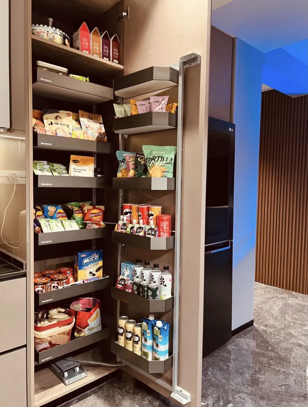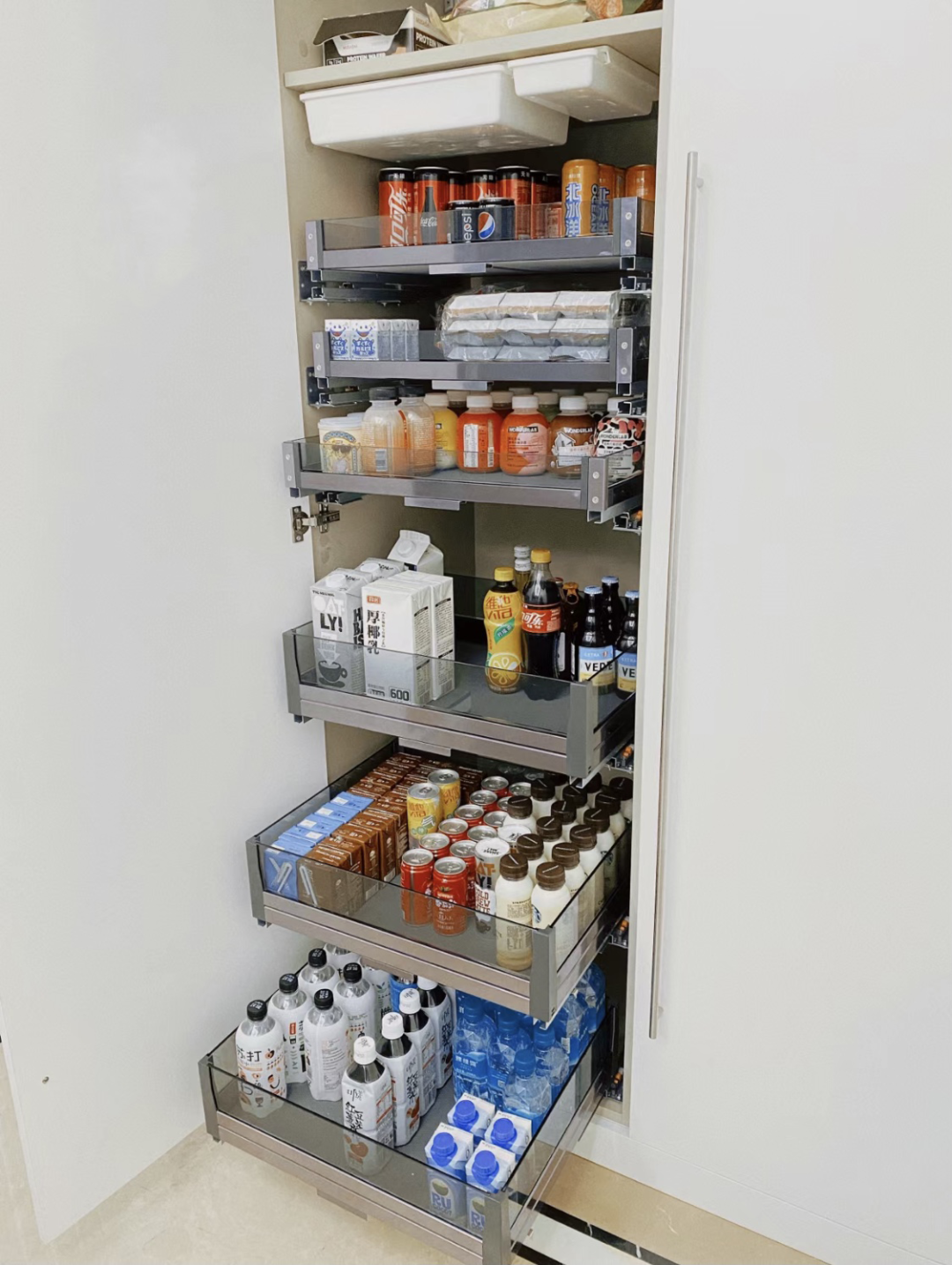 如果真想打造零食柜,最好选和柜门分体的那种零食柜拉篮。柜子最好别用反弹器,其它的柜子可以不安装把手,但是零食柜最好选择带把手的。