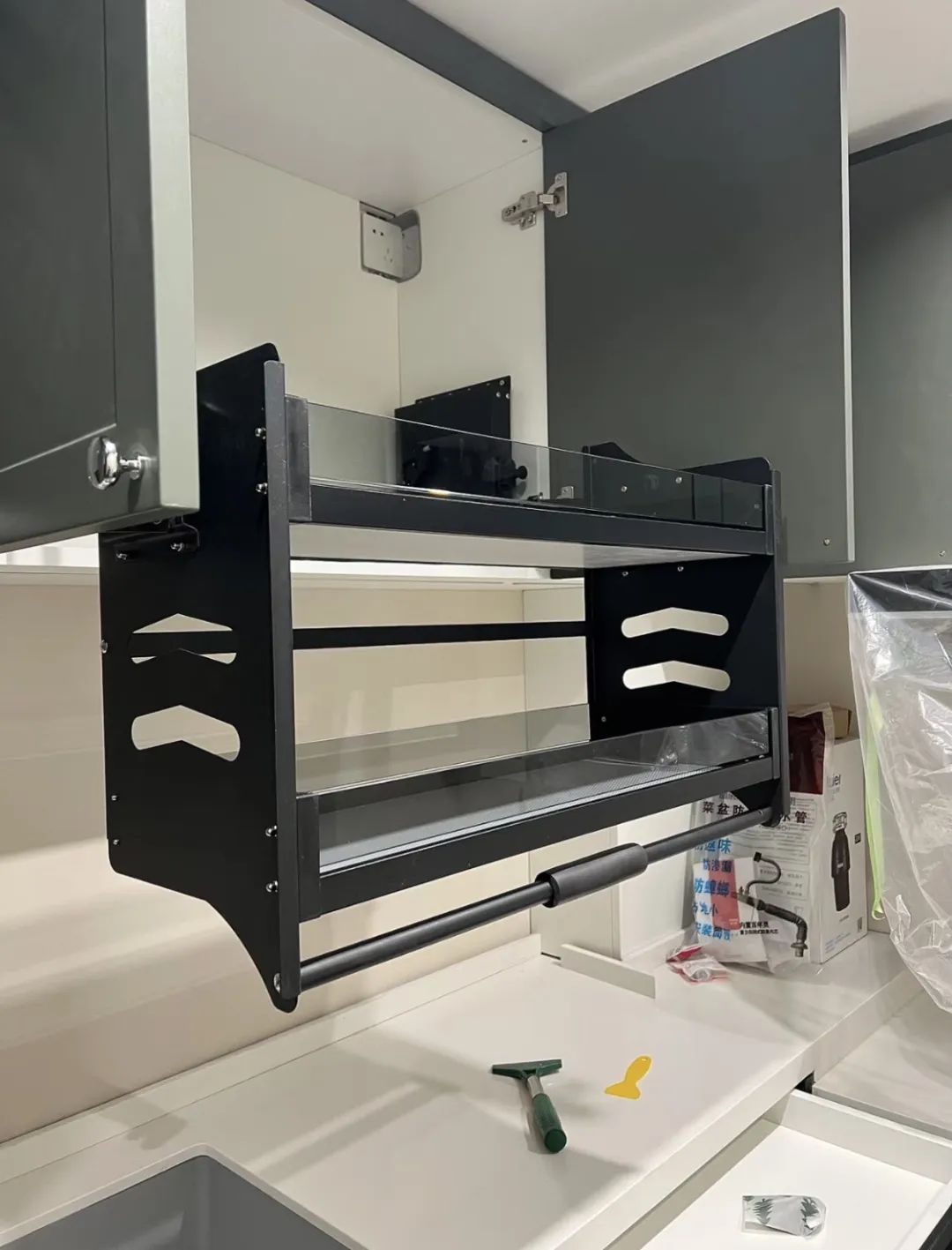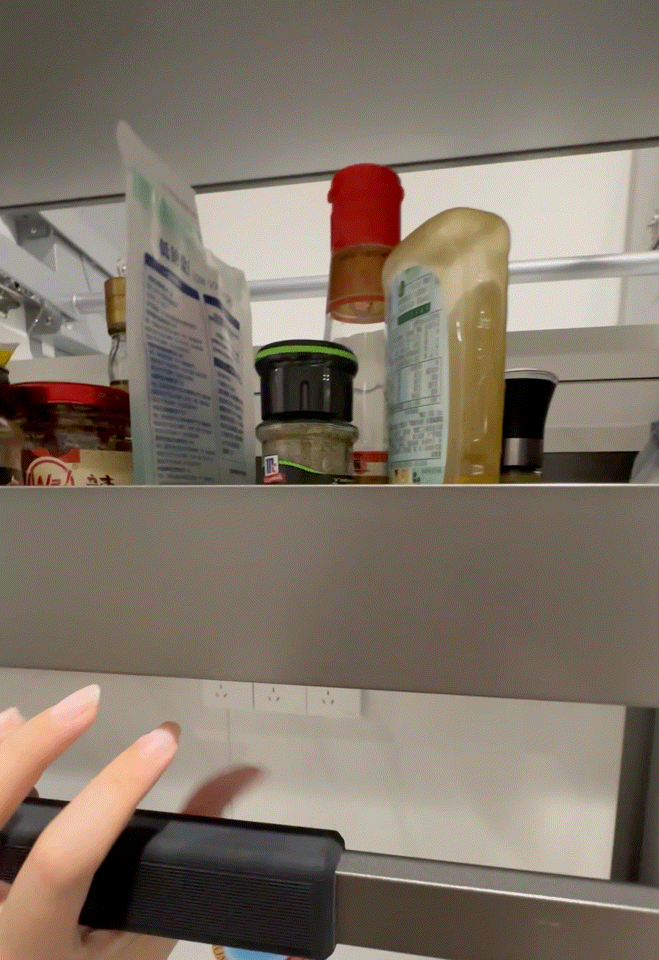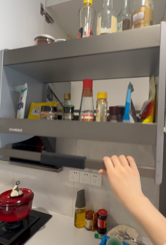 理想很丰满,但当你真把瓶瓶罐罐摆上去就会发现,这重量下拉篮根本承受不住,降的时候得用手托,不然直接一个极速坠落,绝对给你吓得不轻。