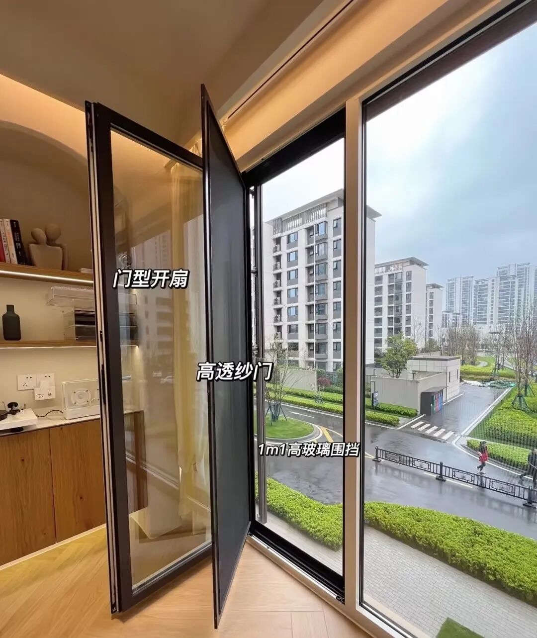 用加厚型材做的推拉窗,可以搭配护栏安装,可以根据需要选择窗扇联动数量决定了开窗大小,打开之后,室内与室外连通,家里通风没得说。