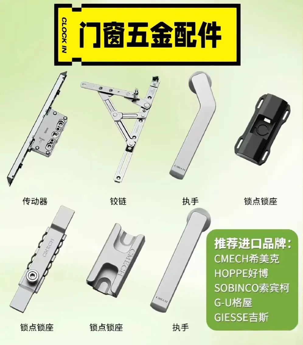 一定要选刚性、强度高、耐腐蚀性的铝合金材质,这样门窗才足够稳固,有经济条件最好选进口五金,比如德国诺托、德国丝吉利娅等,不然时间一长,窗户卡了松了坏了,都是大问题。