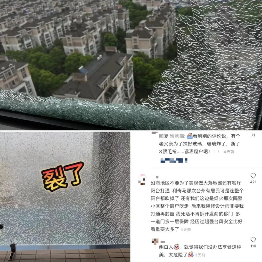遇到极端天气,不管是高层还是低层,玻璃很容易脱轨、碎掉,关键还是玻璃质量差、安装密封不够牢固导致。