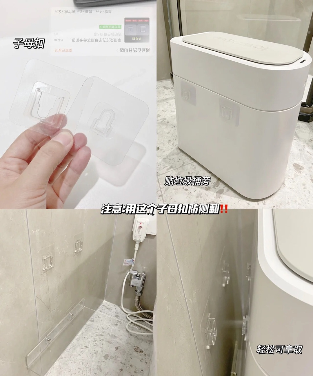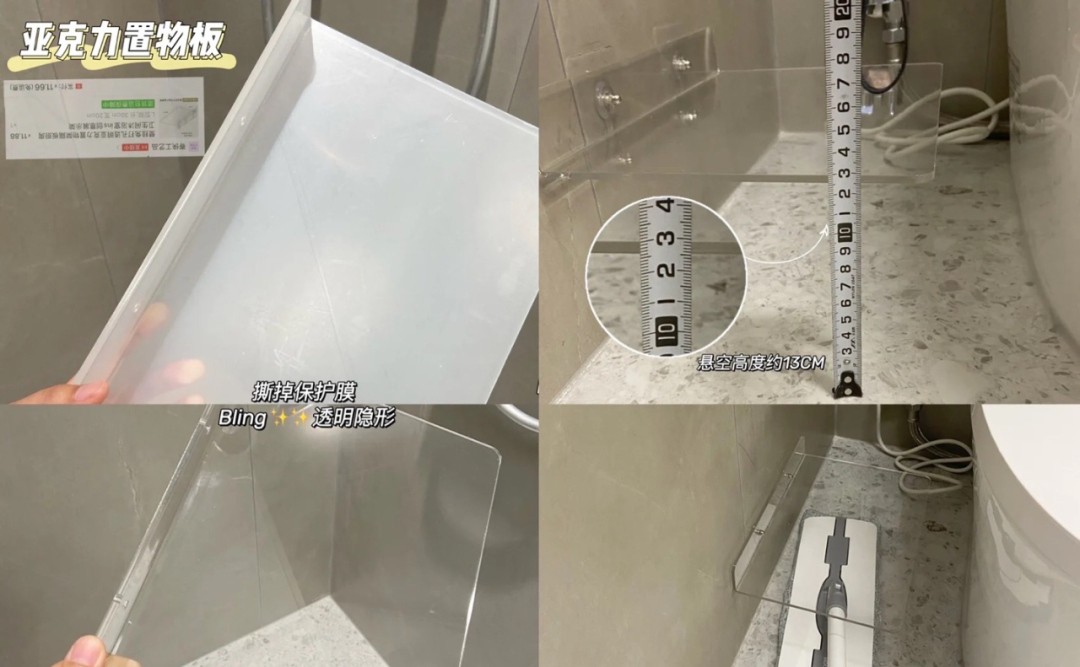 那么,“悬浮垃圾桶”就很有必要,妥妥的提升了干净度,即使你不是个讲究人,也会觉得很赞,你需要准备的是透明亚克力托架,以及两个免钉螺丝贴,和两个免钉子母扣,总共“耗资”十几元。