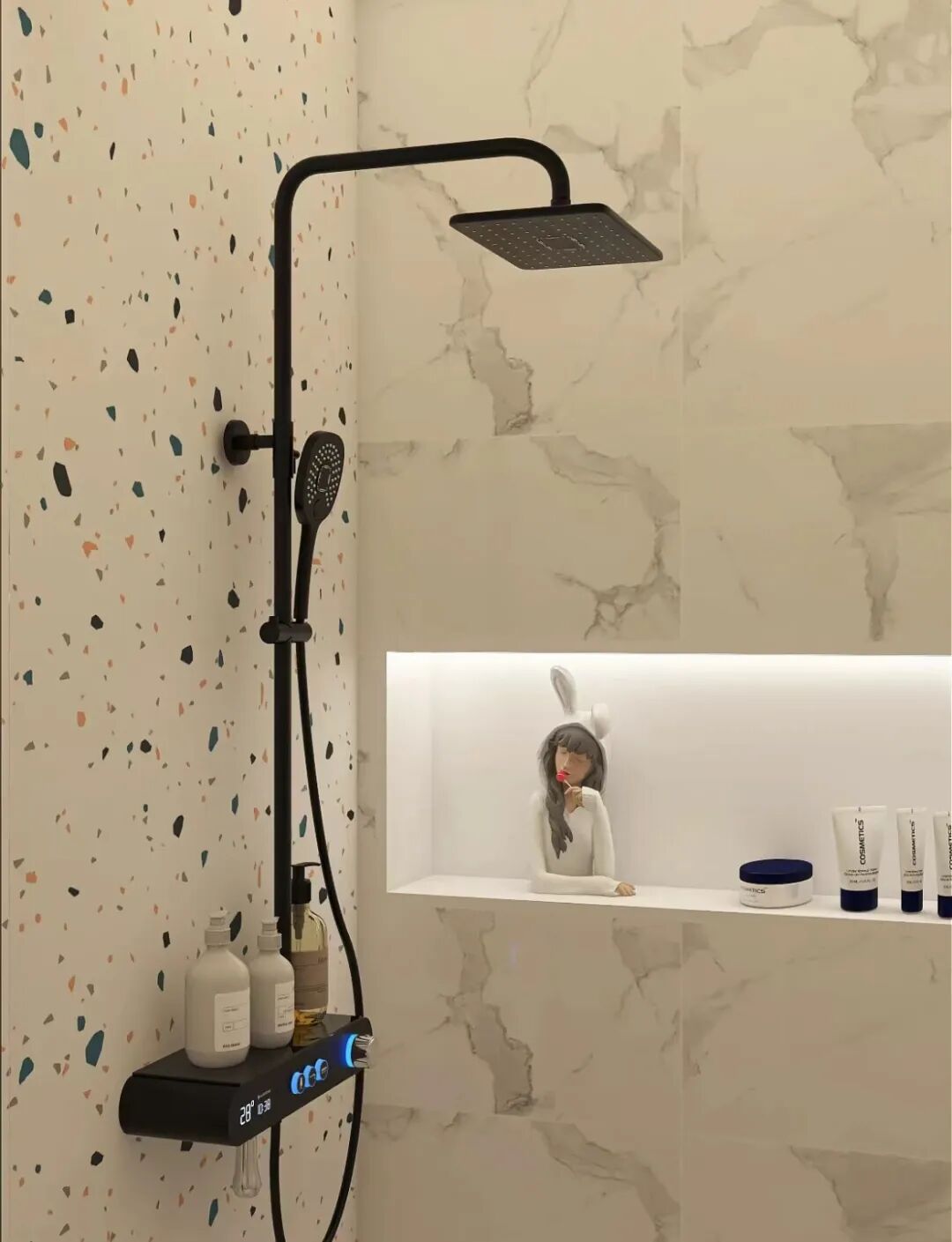 像黑色花洒、浴具等等一系列五金件曾经真的很流行,酷酷的黑色,多高级啊!