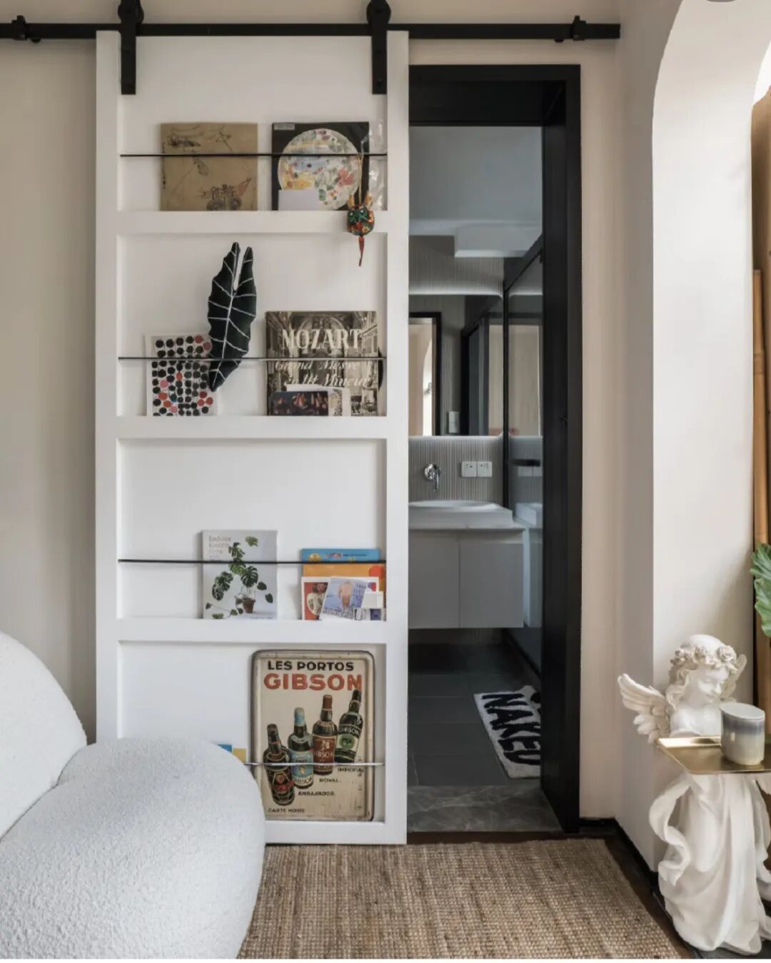 谷仓门在安装的时候是用轨道直接外挂在卫生间门口的,门与墙面之间还有很明显的缝隙、不密封,就是因为这个缝隙,不仅不隔音还不隔气味。
