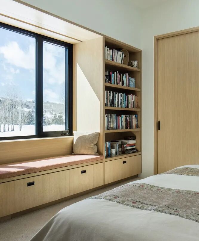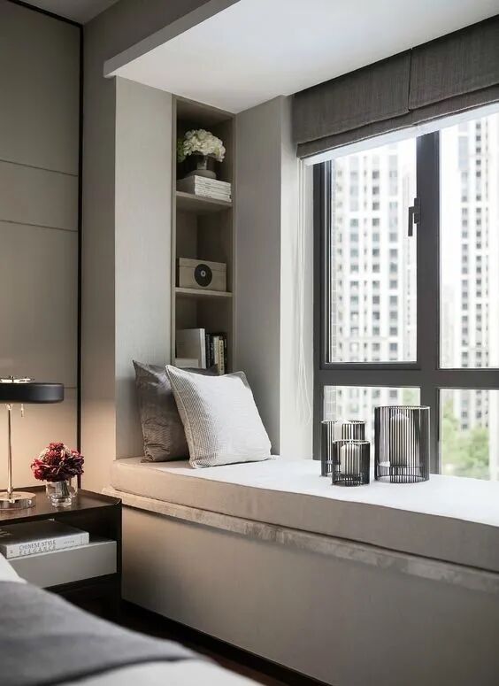 或者与书柜、衣柜合体,获得超大收纳空间的同时,飘窗也变得更大更好用了。