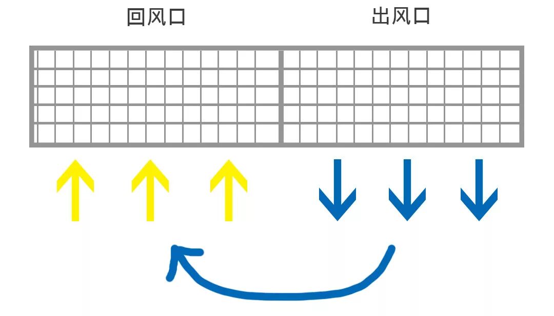 像下图,若是出风口与回风口太近,冷空气一出来都还没下降让整体空间变凉,马上就被吸回去,形成“短循环”,这就是吊隐式空调效果不佳的原因之一。