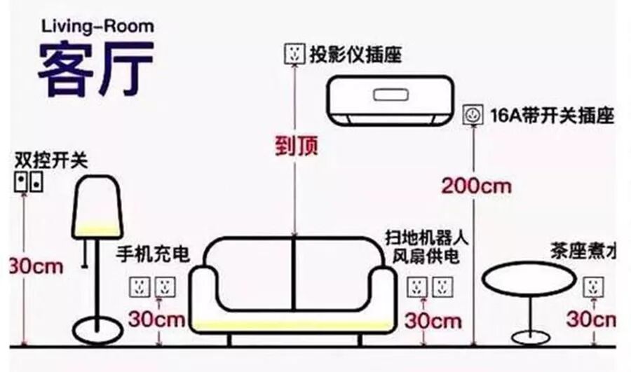 电风扇、扫地机器人,甚至是用来手机充电的插座,建议设置30cm高。而像空调开关则是建议离设备近些,建议拉高至2m。若家中是设置投影布幕,投影仪的插座则要做到吊顶。