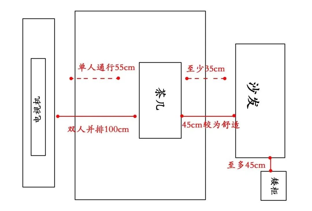 茶几与沙发距离:≥35cm人可以放下双脚,45cm左右,就可以舒适地伸腿啦~柜子与沙发的距离最好≤45cm,茶几与电视间距单人通行需55cm左右,两人并排需100cm。