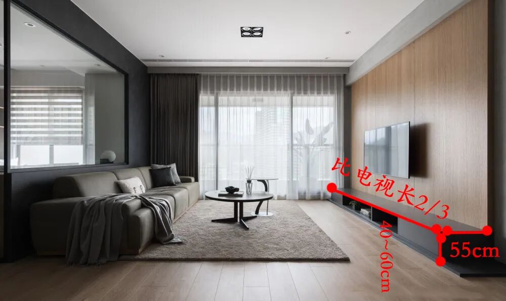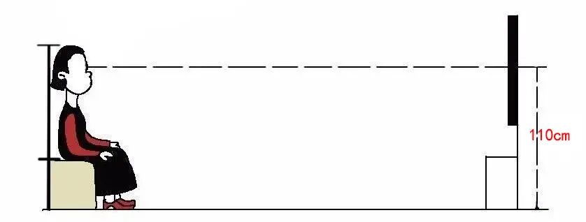 除此之外,电视的安装高度一般应在110cm左右(电视机的中心点等于或者略低于视觉中心,如下图所示)比较合适,可以显著提升看电视的舒适性度。