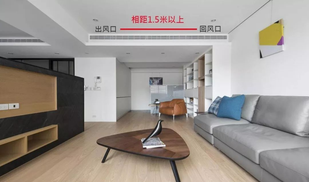 建议出风与回风之间要相距1.5m以上才好,最大程度上确保冷热循环和室温的调节。