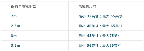 很多家庭买电视的时候为了有更好的观影体验,只想着买大尺寸的,往往忽视了客厅面积能否满足电视较佳的观影距离,尤其是有老人和小孩的家庭更应注意这个“小细节”,以下是几种视距下相对应的电视最佳尺寸,仅供参考: