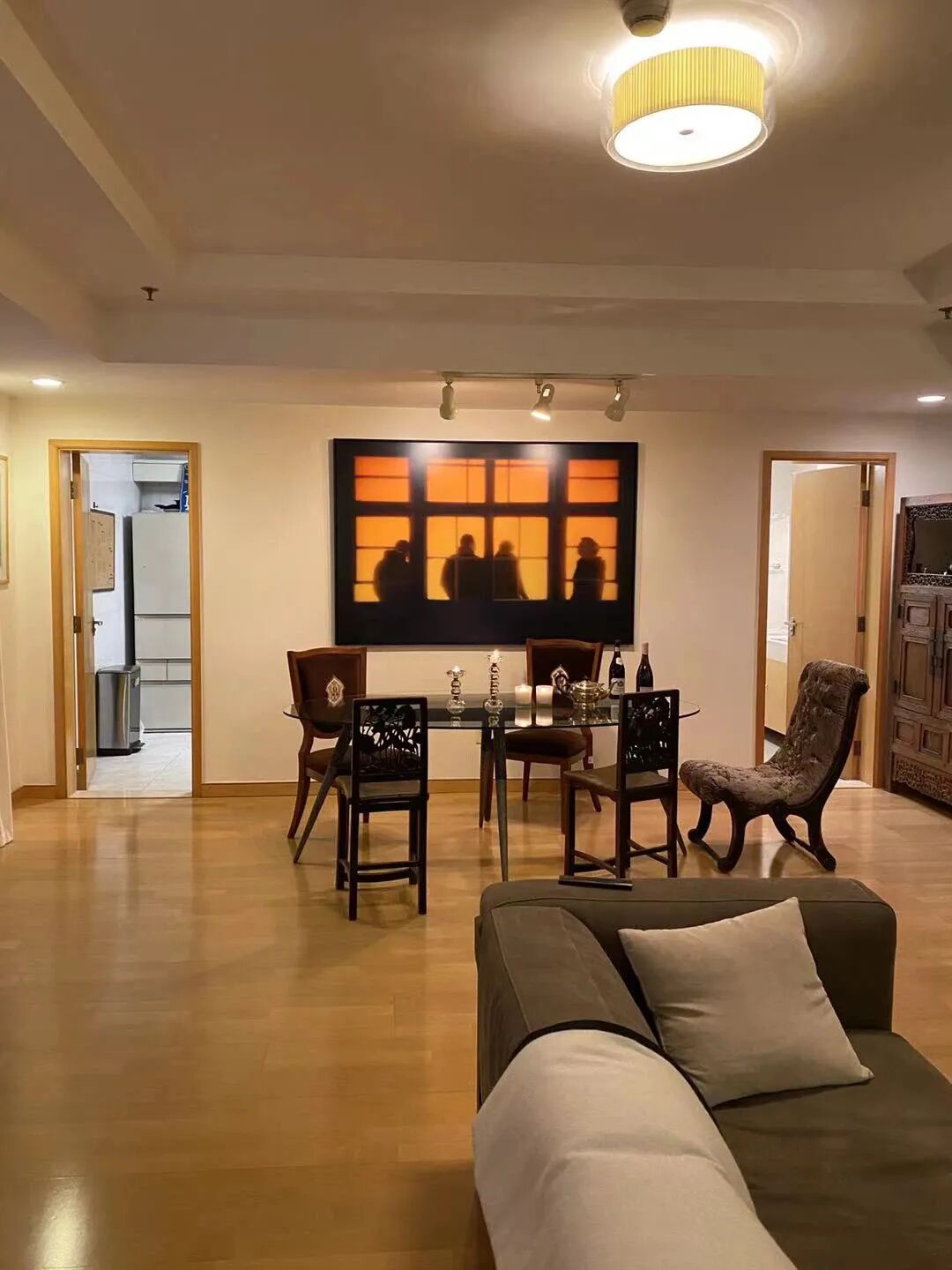整个客厅打破传统中式布局模式,反而因为各处墙面的艺术画,更像是一个私人画廊。