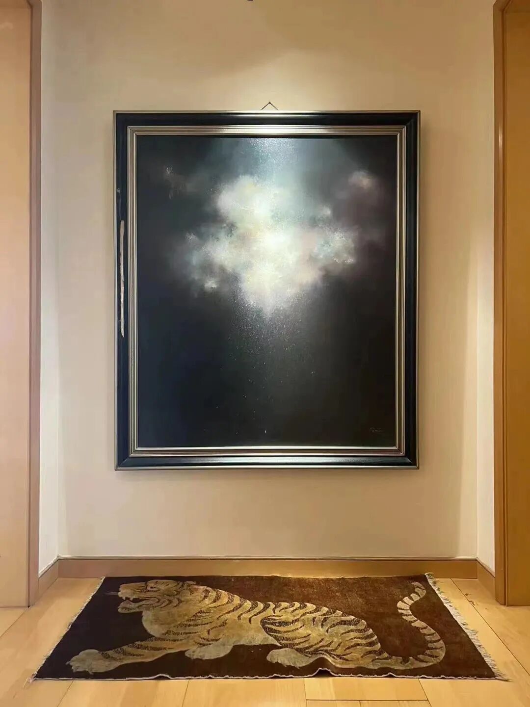 熟悉的人都知道朱珠喜欢收藏艺术品,特别是绘画,刚进走廊挂着一幅抽象画,是朱珠的第一件藏品——沈涛的《烟花》;搬离外交公寓后,朱珠也将挂画一起搬到新家,搭配来自清代地毯,生肖“虎”的图案,与艺术画搭配出一种与众不同的自然,有种绚烂。
