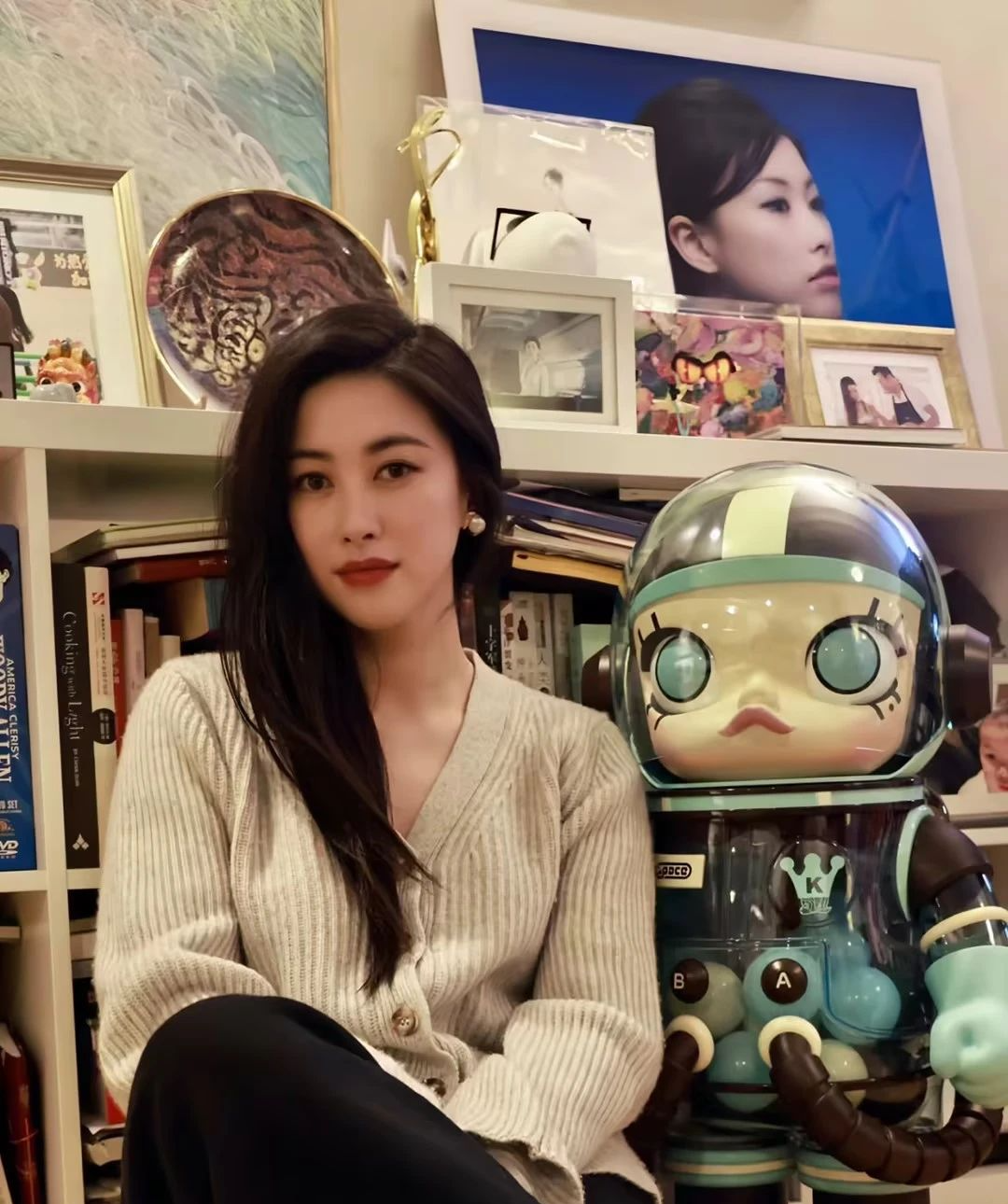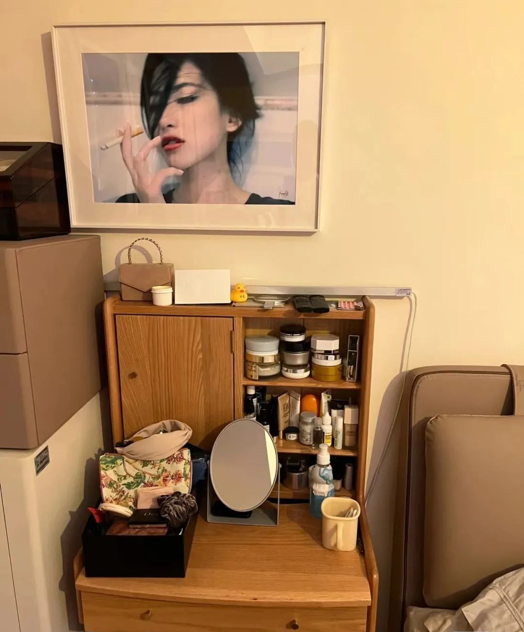 说到沙发后侧区域的阅读区,有朱珠收藏的各类艺术摆件、挂画、潮玩,还有年轻时的自拍照、奖杯......可能这个区域就是一个“时间胶囊”,包裹着她个人成长的点滴,完全不受所谓“空间”的束缚,让客厅妥妥变为一个容纳性、功能性极为多样的空间。