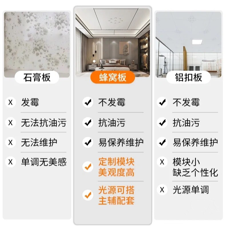 石膏板堪比花瓶,好看无用,受潮之后容易发霉;蜂窝大板好是好,如果你家厨卫本来就不大,预算有限就没啥必要,不会影响整体质量,检修的时候还不方便(空间大、预算充足可选)。