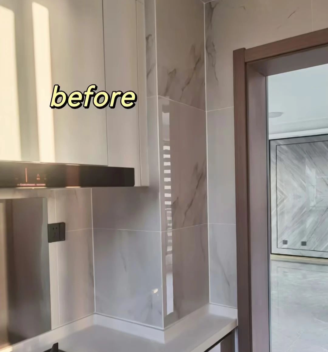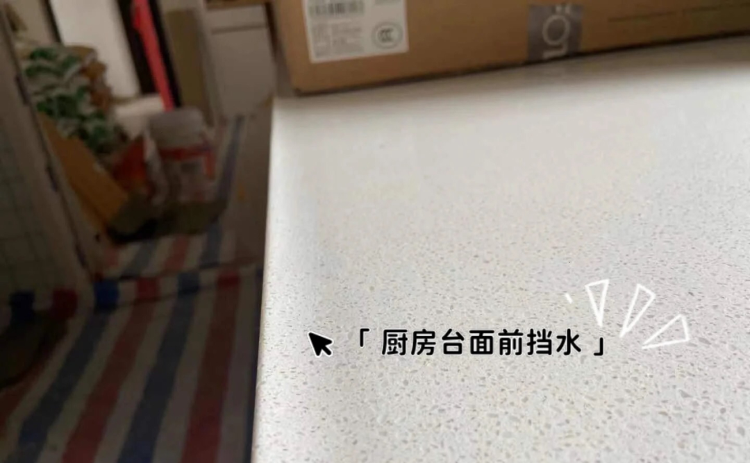 另外,可以保留台面前挡水边儿,防止返水留到柜面,直接像👆这样,一定要在购买石英石台面的时候,提前和师傅沟通好,后期用起来才真的香。