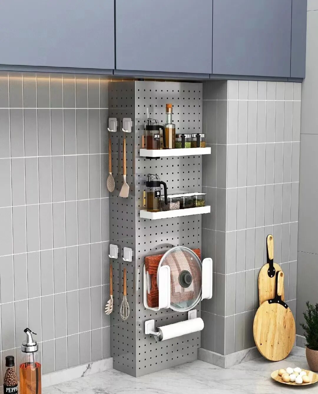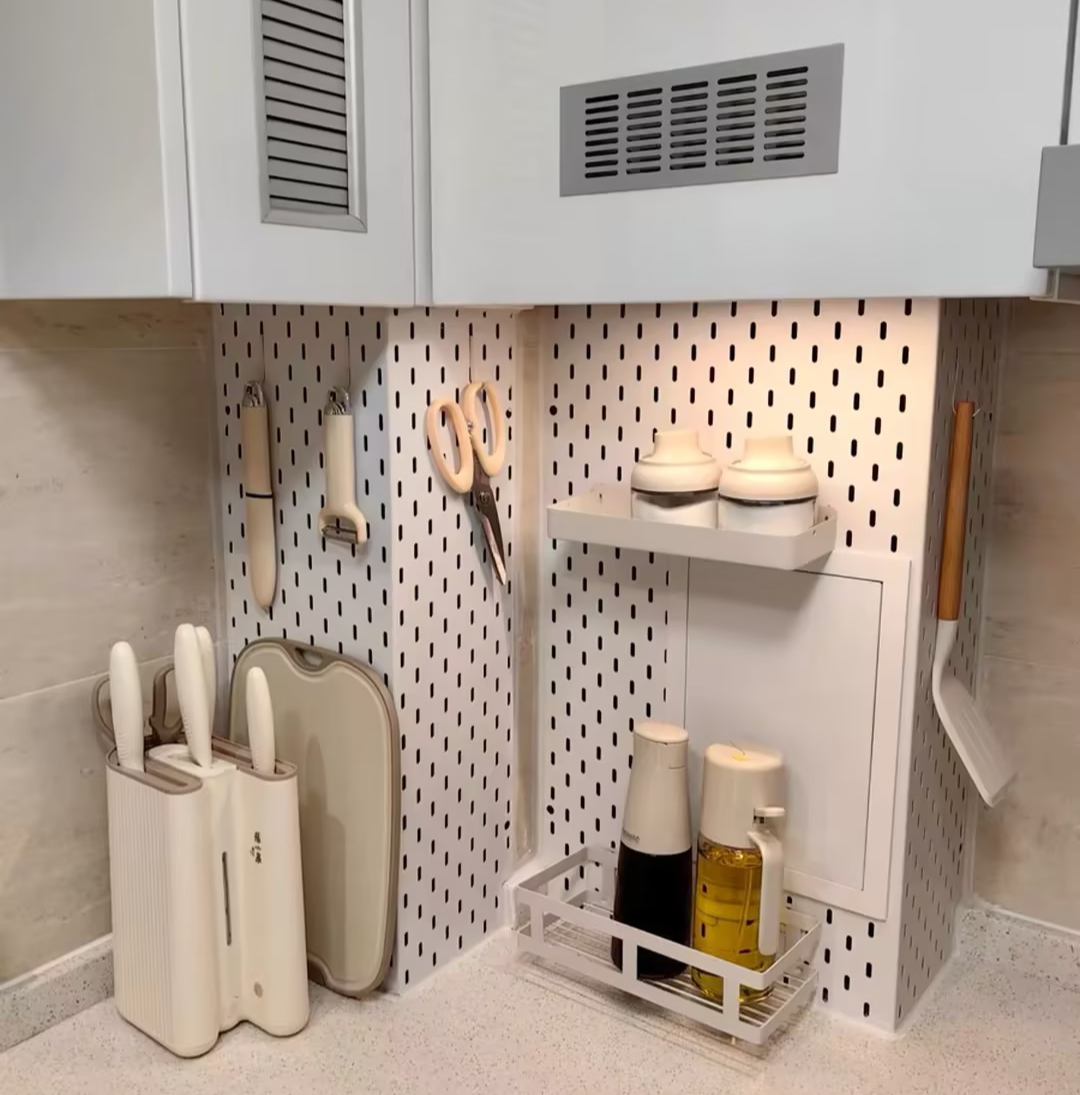 当然,已经砌墙包了烟道的,同样可以用垂直收纳,将烟道管壁利用起来。👇在烟道管壁上贴几块洞洞板,用来收纳厨房小工具、调料盒等,就在灶台旁,用起来也顺手。