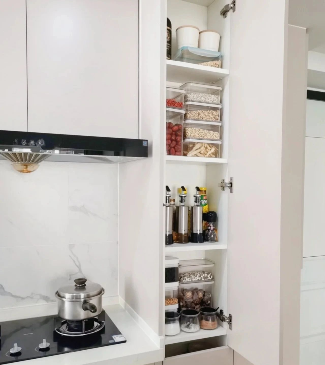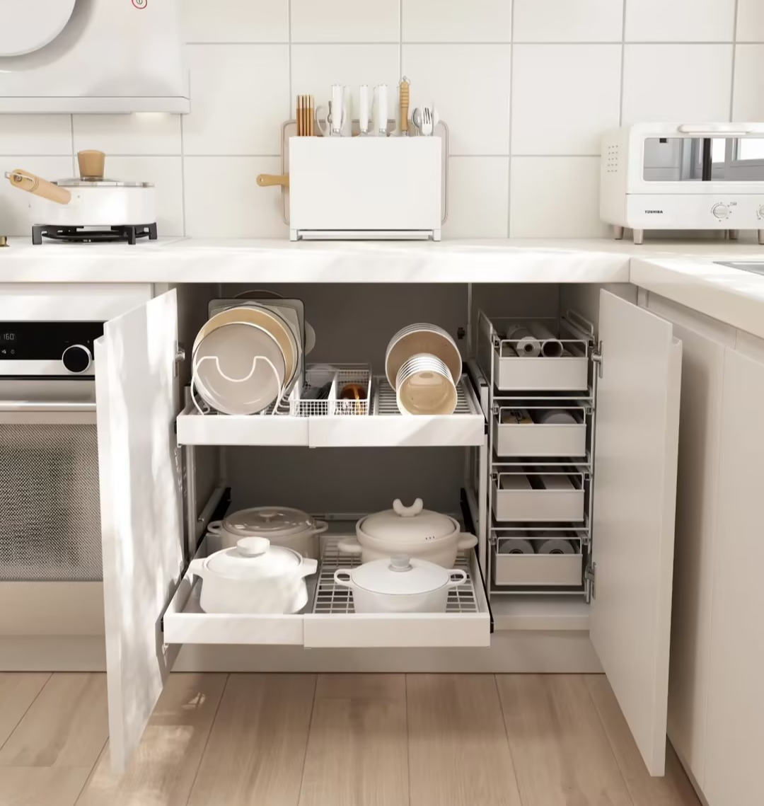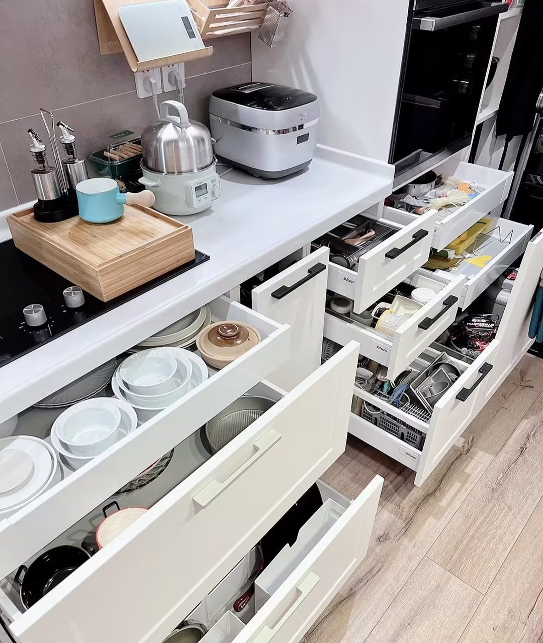厨房收纳最好用的就是抽屉,比拉篮还好用,如果有条件一定要用全拉式的,方便拿取。