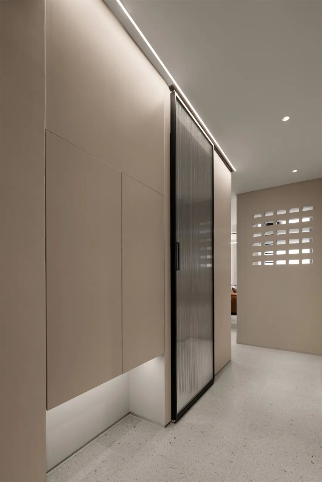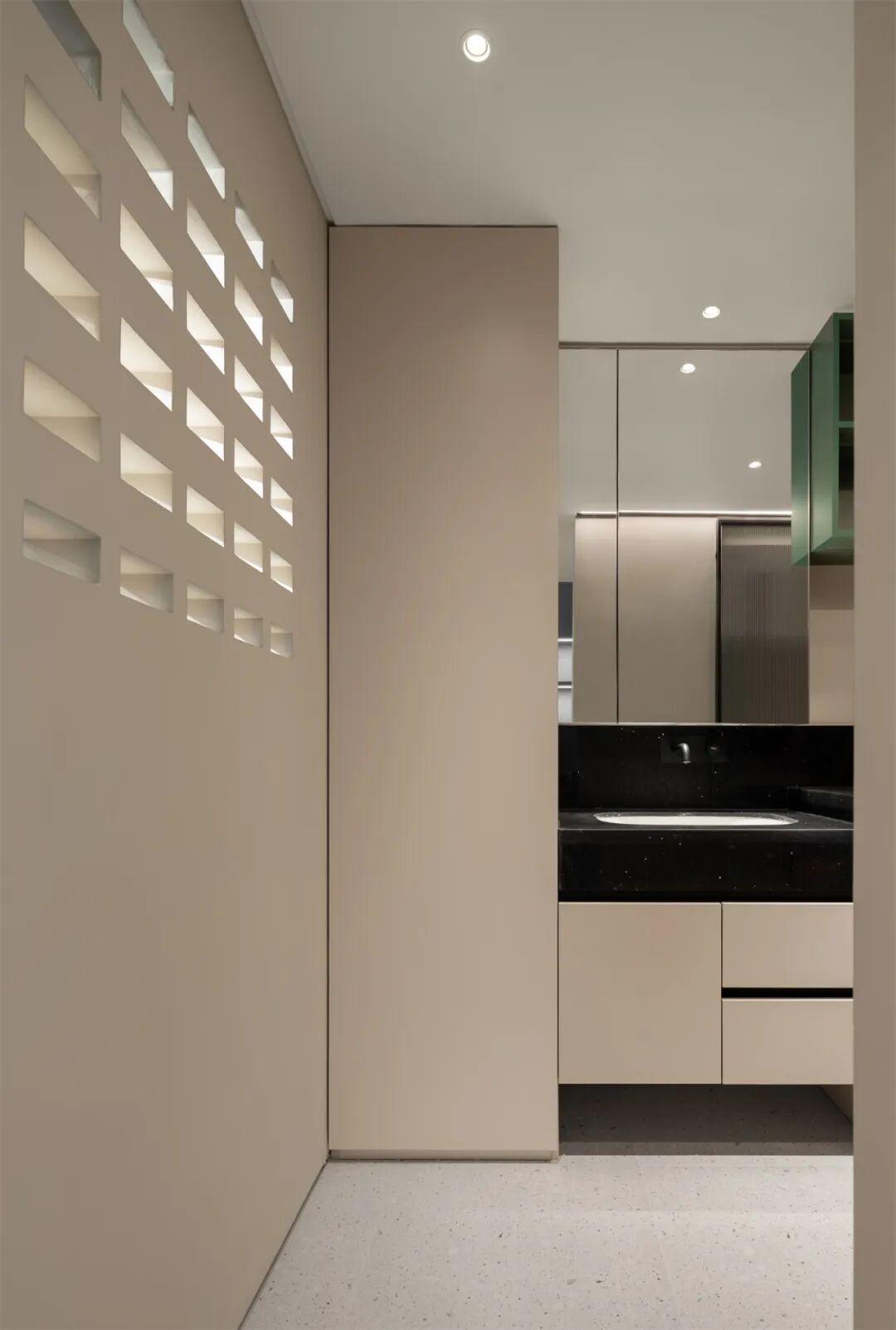 在玄关与客厅之间,以一面镂空墙面作为隔断来分区,几何感的设计点缀,强化了光影的变化,在功能性与私密性之间权衡的恰到好处。