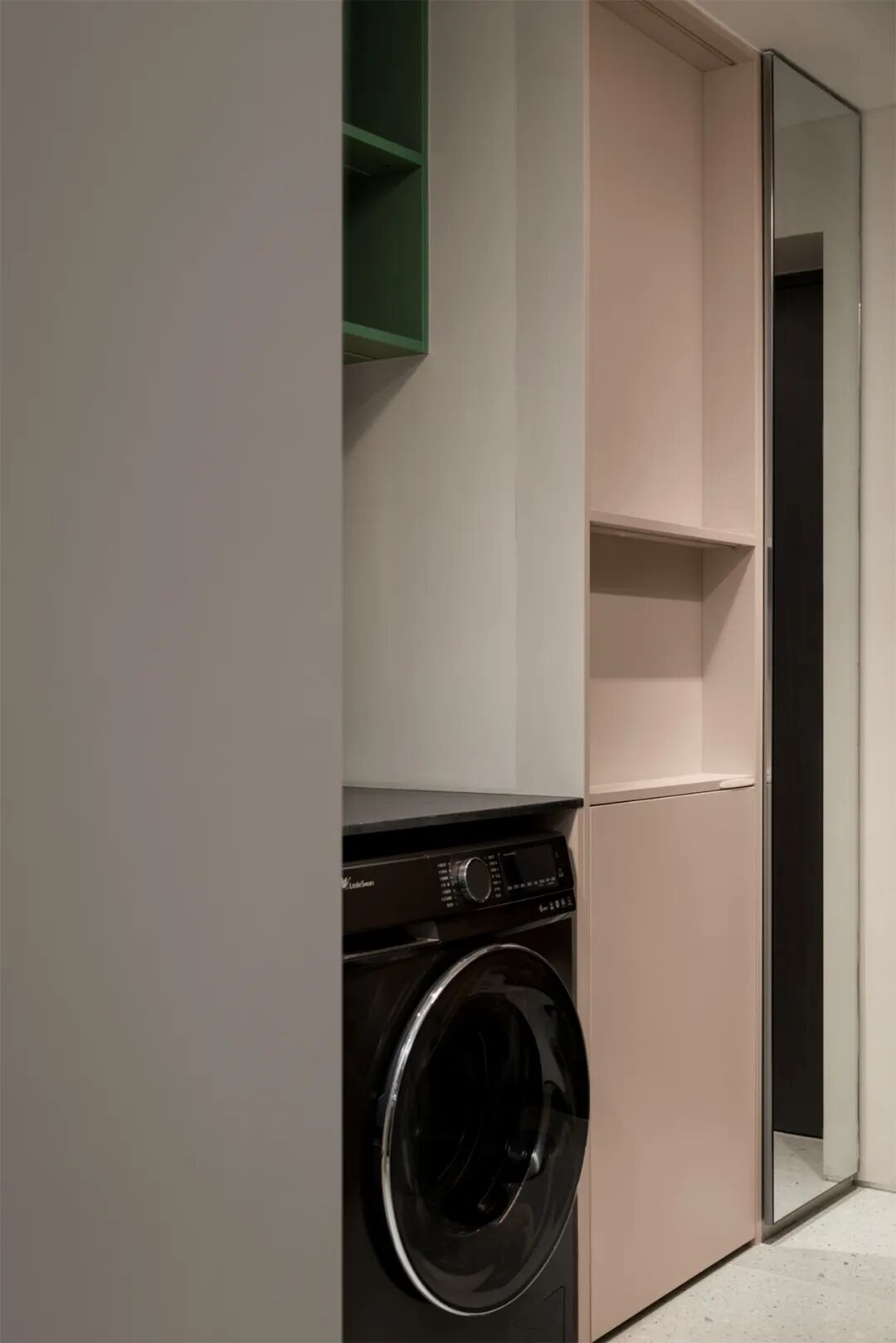 根据空间天然的水电排布优势,将洗衣区安排在玄关,既合理的优化了空间,同时,延续玄关的收纳功能,极为生活化;因为玄关顶面无特殊结构,无主灯设计营造归家时的温暖。