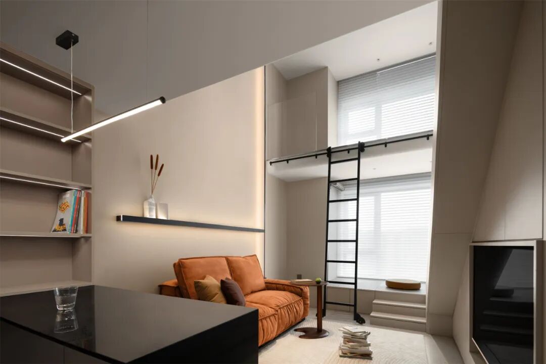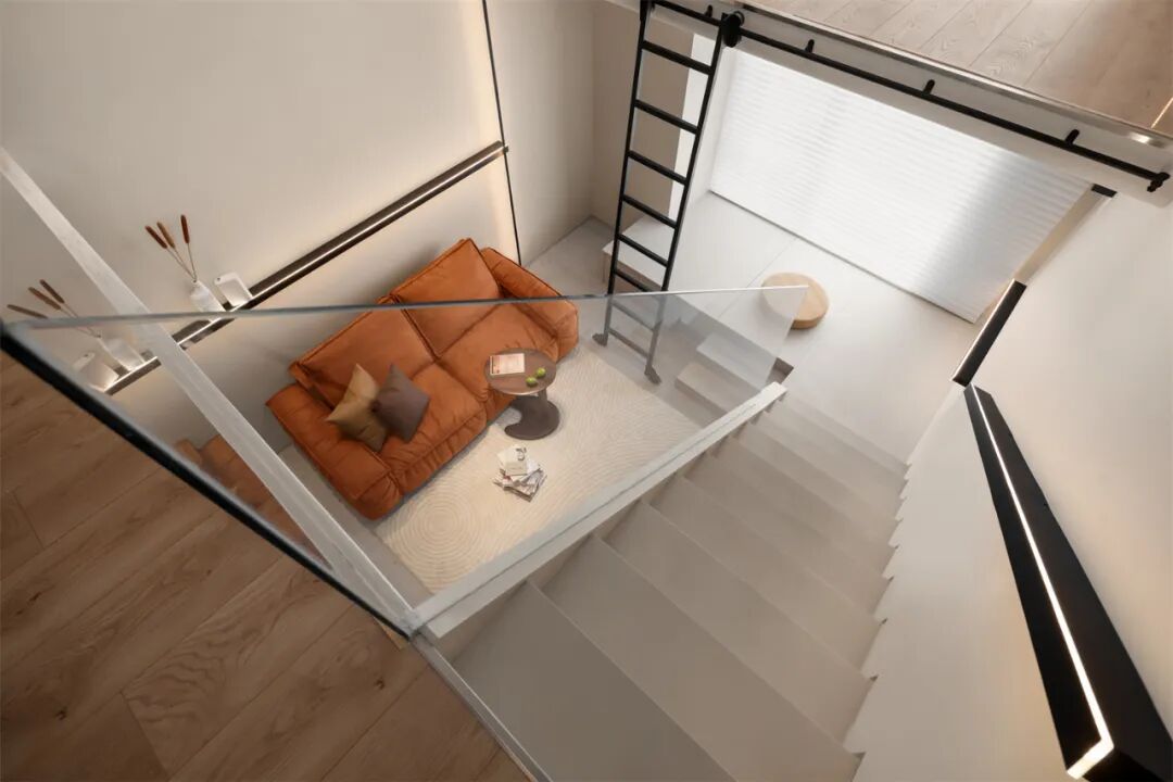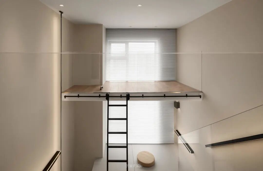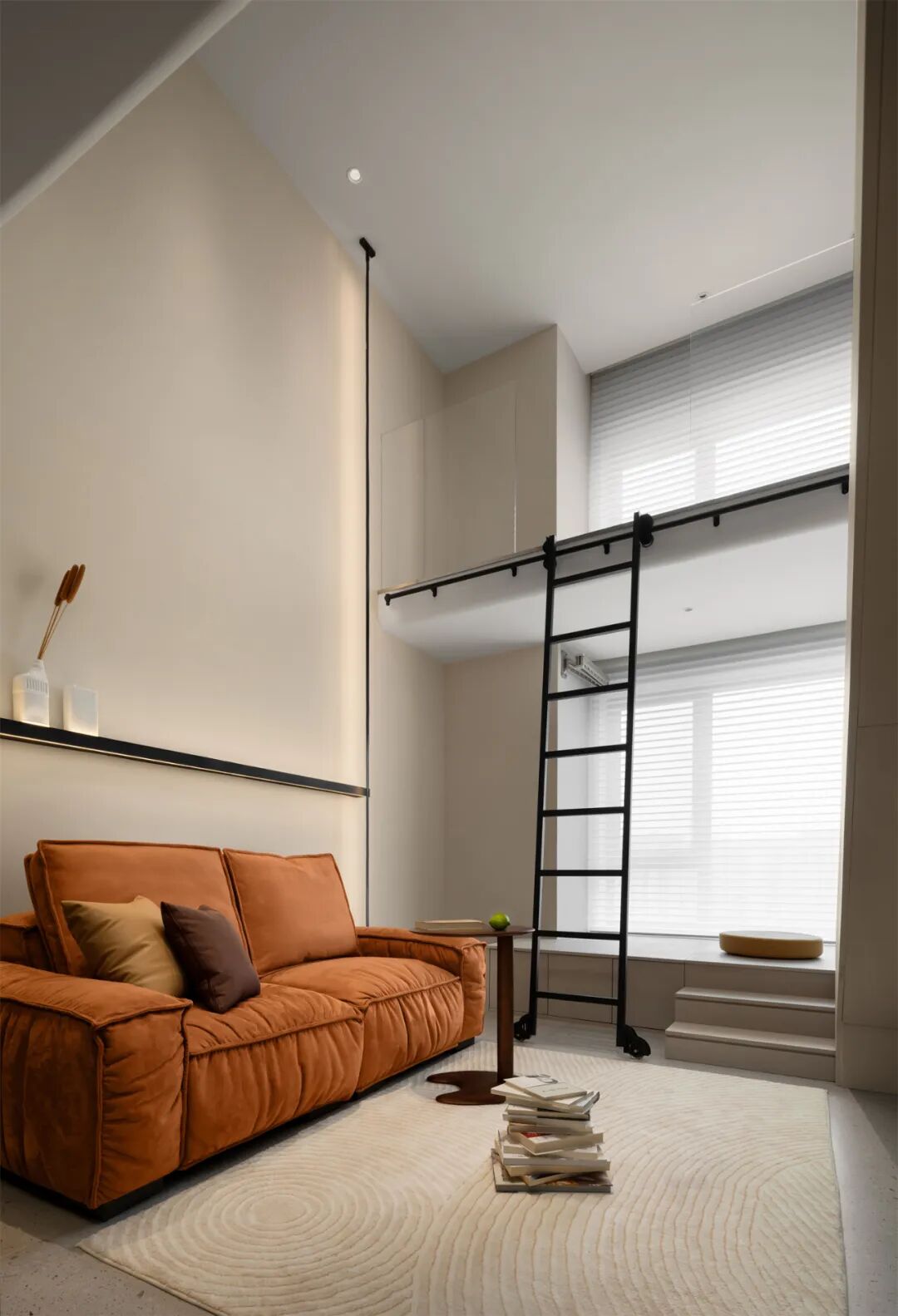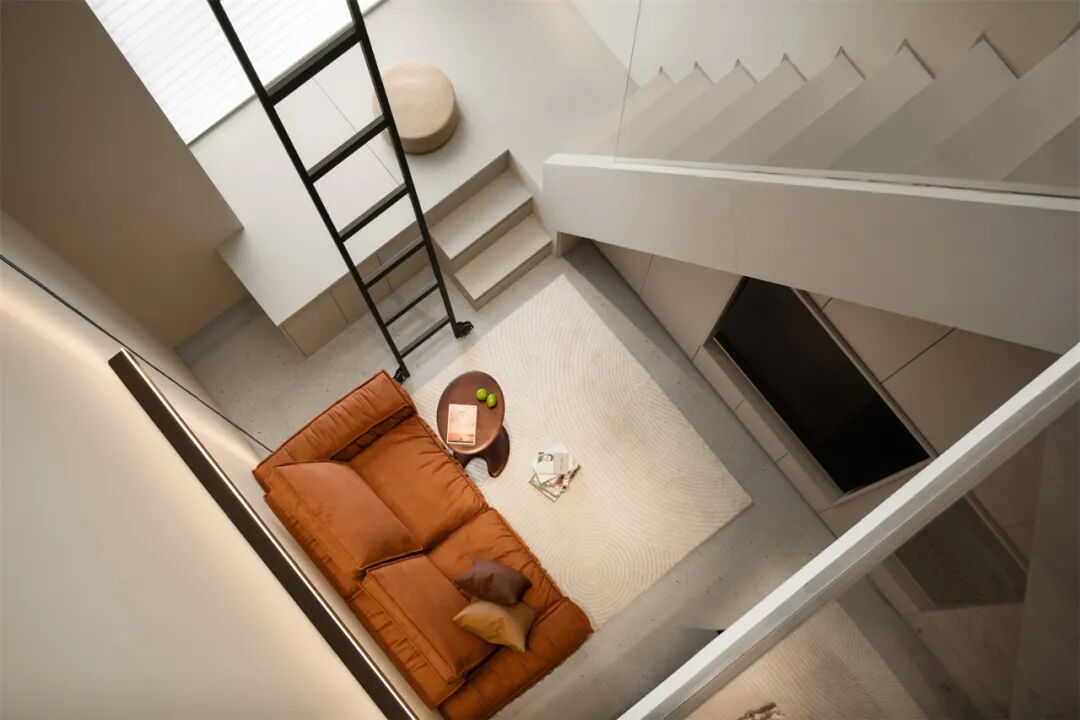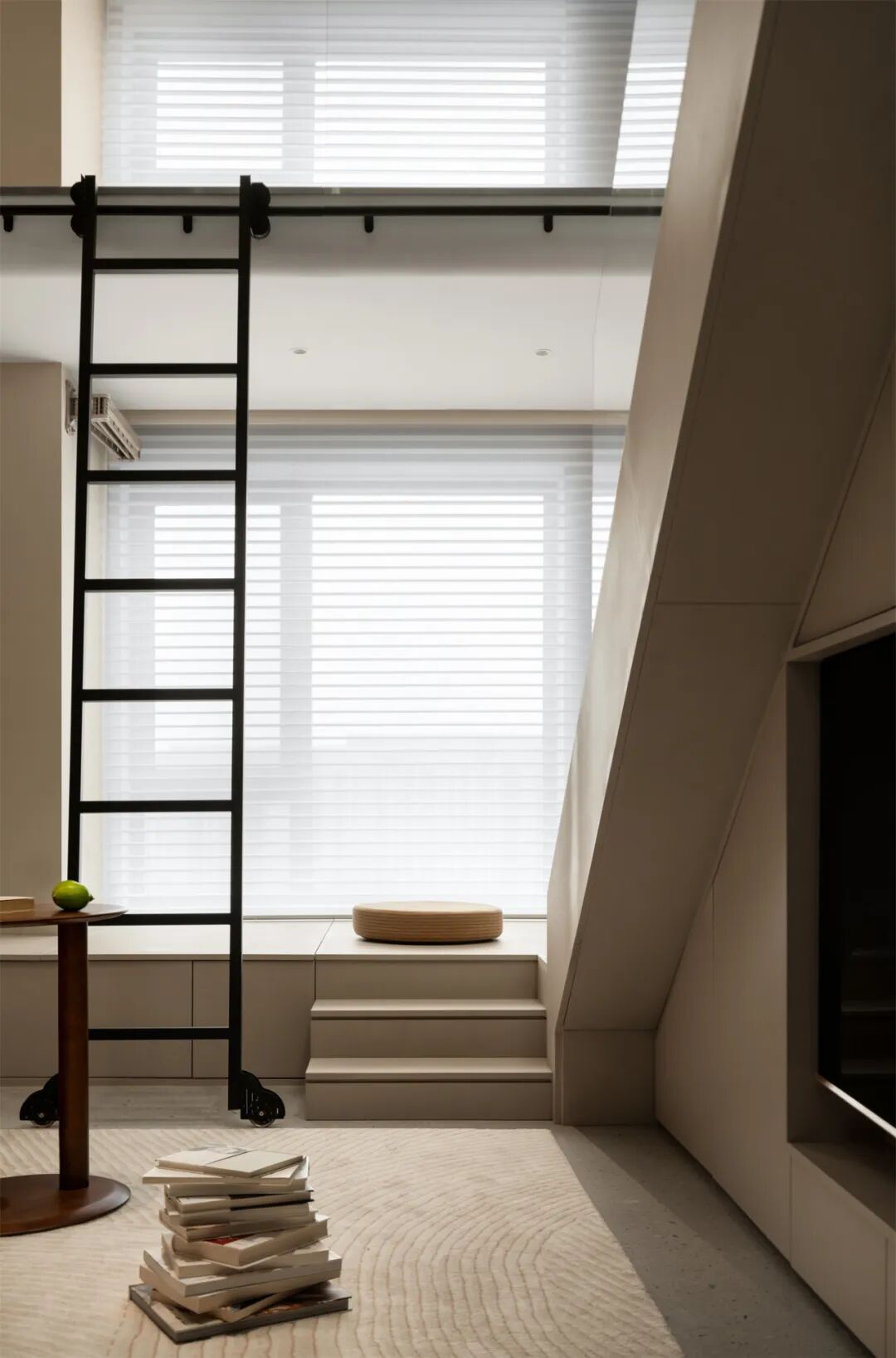 客厅成为了设计的参考轴,住宅内所有的功能均围绕其布置,在空间靠窗的位置,利⽤空间的垂直尺度,将窗边阳台打造成了⼀个新的“天空之城”,作为空间中附属的休闲区,通过爬梯上到平台,欣赏都属于⾃⼰的城市天际线。