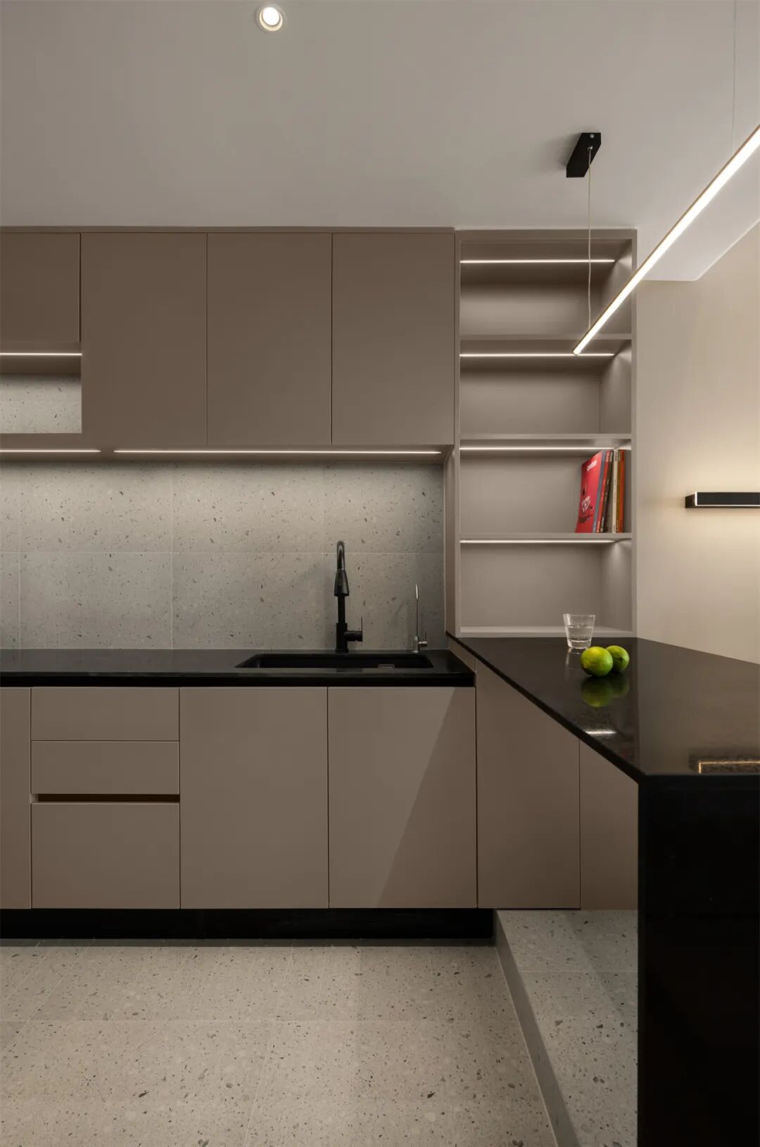厨房除了必备的功能之外,设计了一个开放式的吧台,让空间尽量连续开放,同时根据使⽤功能赋予空间材质和尺度不同变化,让屋主在⽇常⽣活中不受空间边界限制,为⽣活场景中⾃由随⼼的⾏为创造更多的可能性。