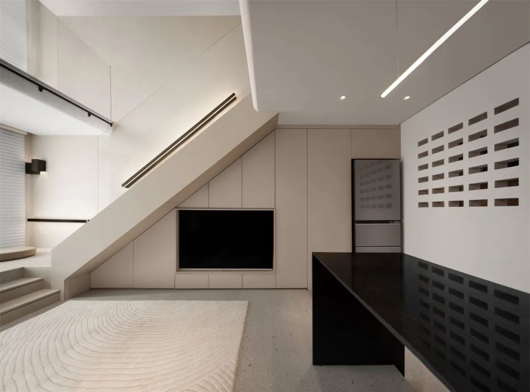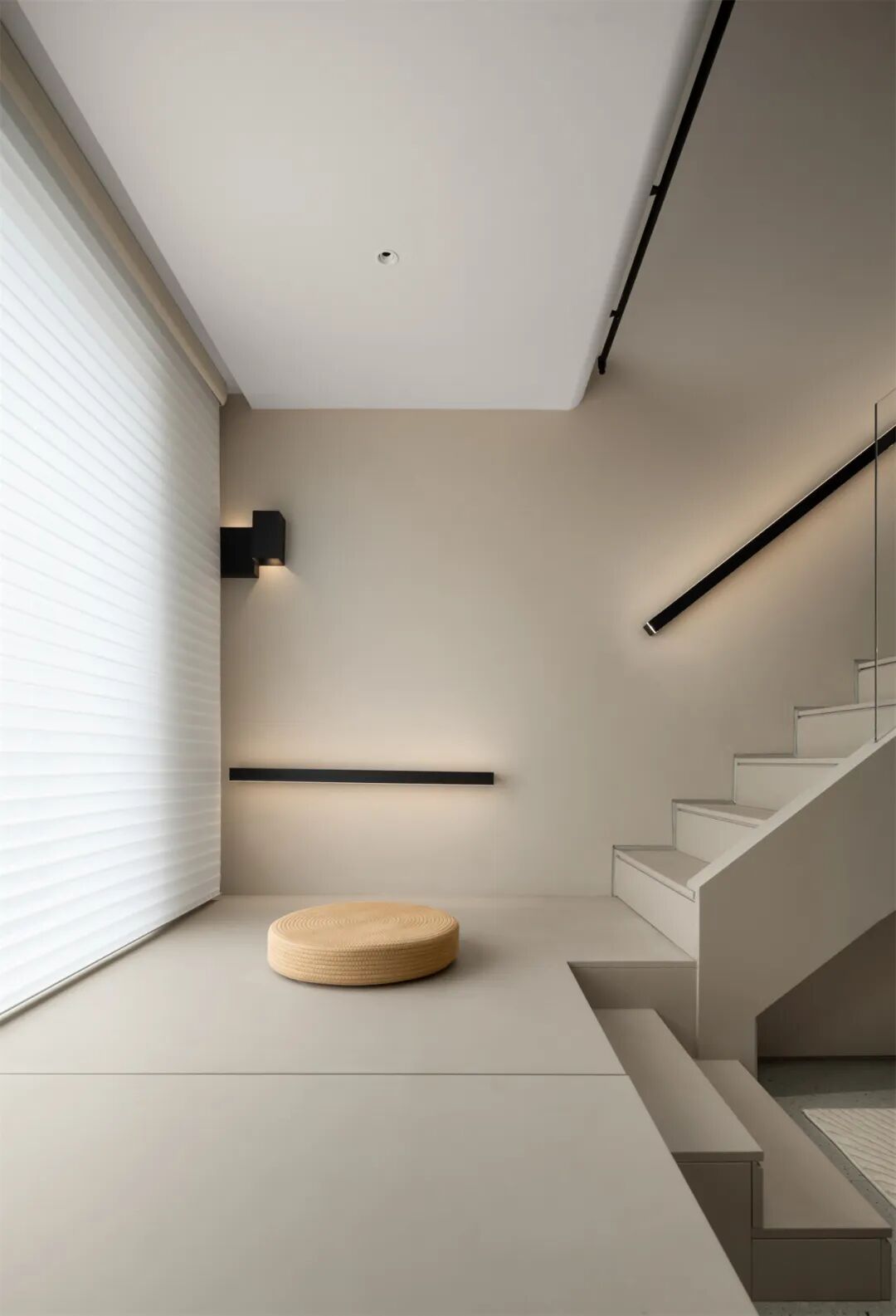 大块面的线条和色块让整个空间整洁大气。在灰与白相互呼应的空间中,材质和光影演绎的宜居实践,以空间写诗。