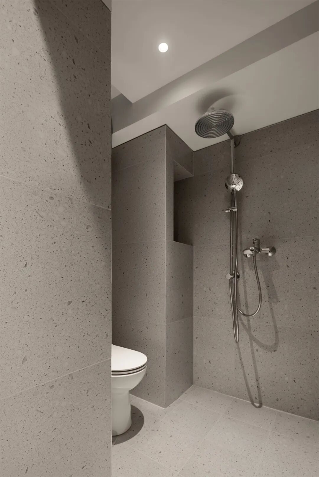 卫生间并没有明显的干湿分区设计,反而更有整体感,灰色调瓷砖铺贴因为光影带来的虚与实,明与暗,有秩序地营造出简约纯粹而又温馨舒适的现代居住空间。