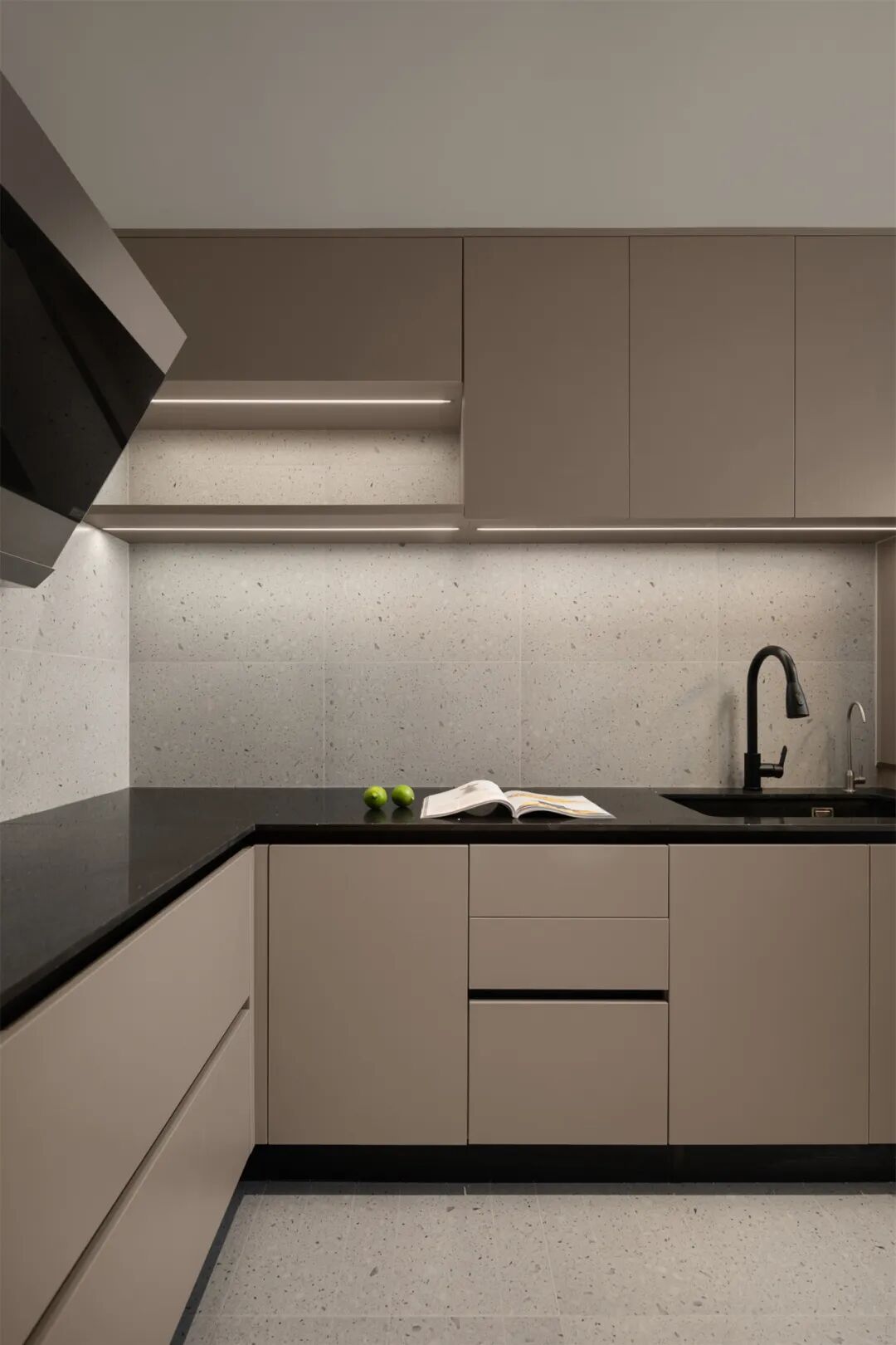 L型厨房以开放式的设计实现空间之间有序的过度,橱柜选用PET肤感柜⻔,哑光的质感提升空间的整体⽓质,同时降低光在空间中的反射率,相较于哑光的烤漆⻔板达到视觉效果且能够合理的控制预算。