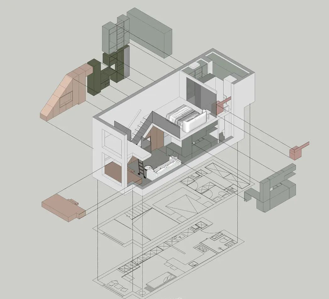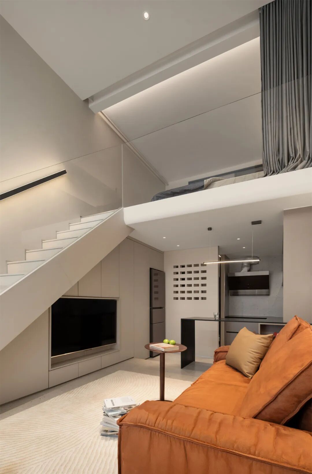 仅仅30㎡的LOFT公寓想要实现女屋主对空间的诉求其实并非一件简单的事儿,首选从面积上,以新建夹层的处理方式来解决挑高公寓面积小的问题,其次,在既有的空间的条件下,模糊空间界限,取消封闭间隔,以人的活动定义功能,以现代简约的设计,传达空间温和、细腻的气质,在都市中寻求“容身之处”的梦,回归质朴与自然,拥抱自我生活。
