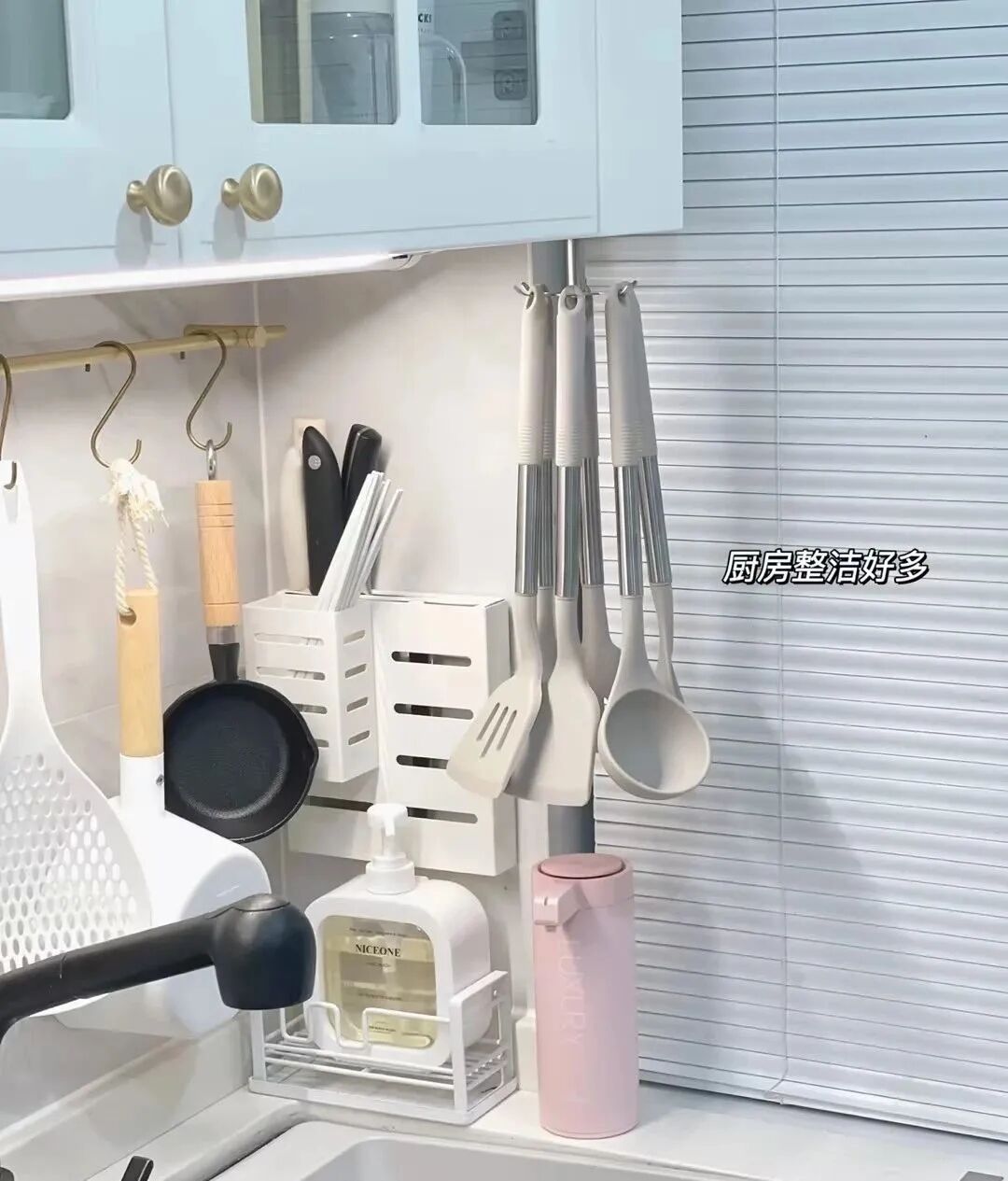 厨房里勺子和铲子用一次性粘钩很容易掉,这个六爪非常牢固,而且占地位置非常小,很适合我家小厨房的收纳。