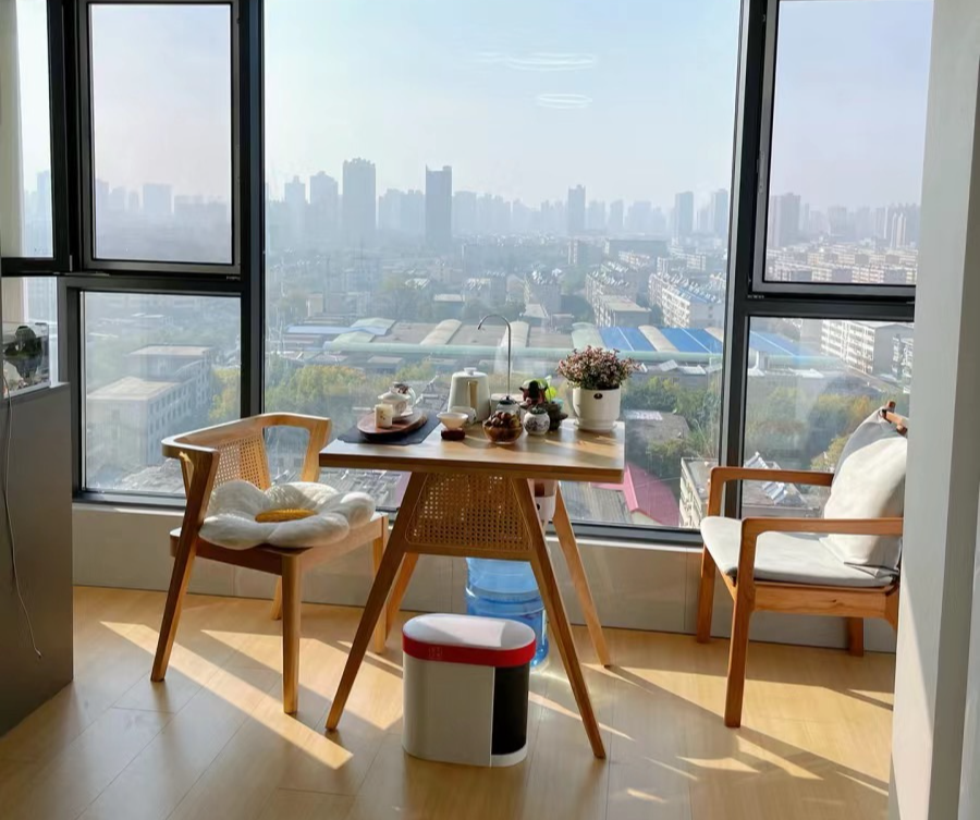 从客厅到阳台的一体化设计更显空间感,阳台是爸妈的茶室,休闲的时候可以再此喝茶、晒太阳、聊天......比起单一的传统客厅来说,这个空间布局上的改变更能满足一家老小的生活需求。