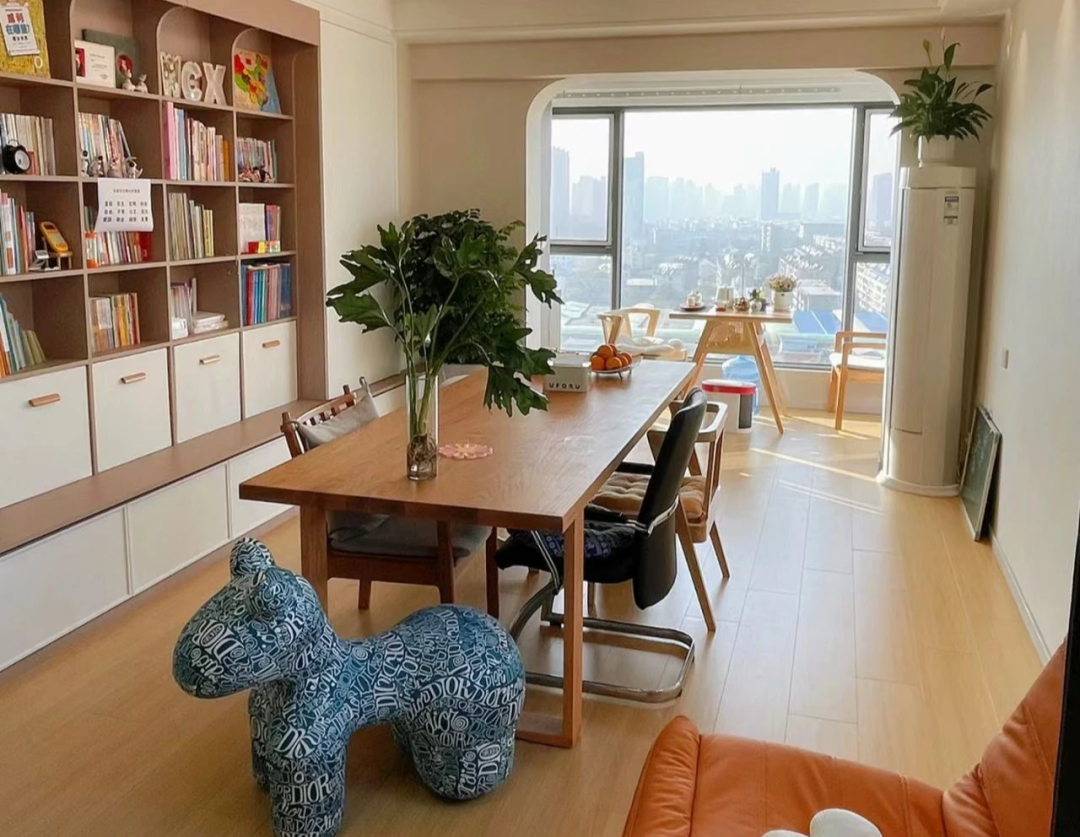 之前家里标准的客厅、茶几和沙发组合,十分占地方,新家因为有孩子,干脆放弃了这“老三样”,木桌和正面书柜墙组合,实现客厅、餐厅兼书房组合,多种使用,无疑改善了家里空间不够的现状。