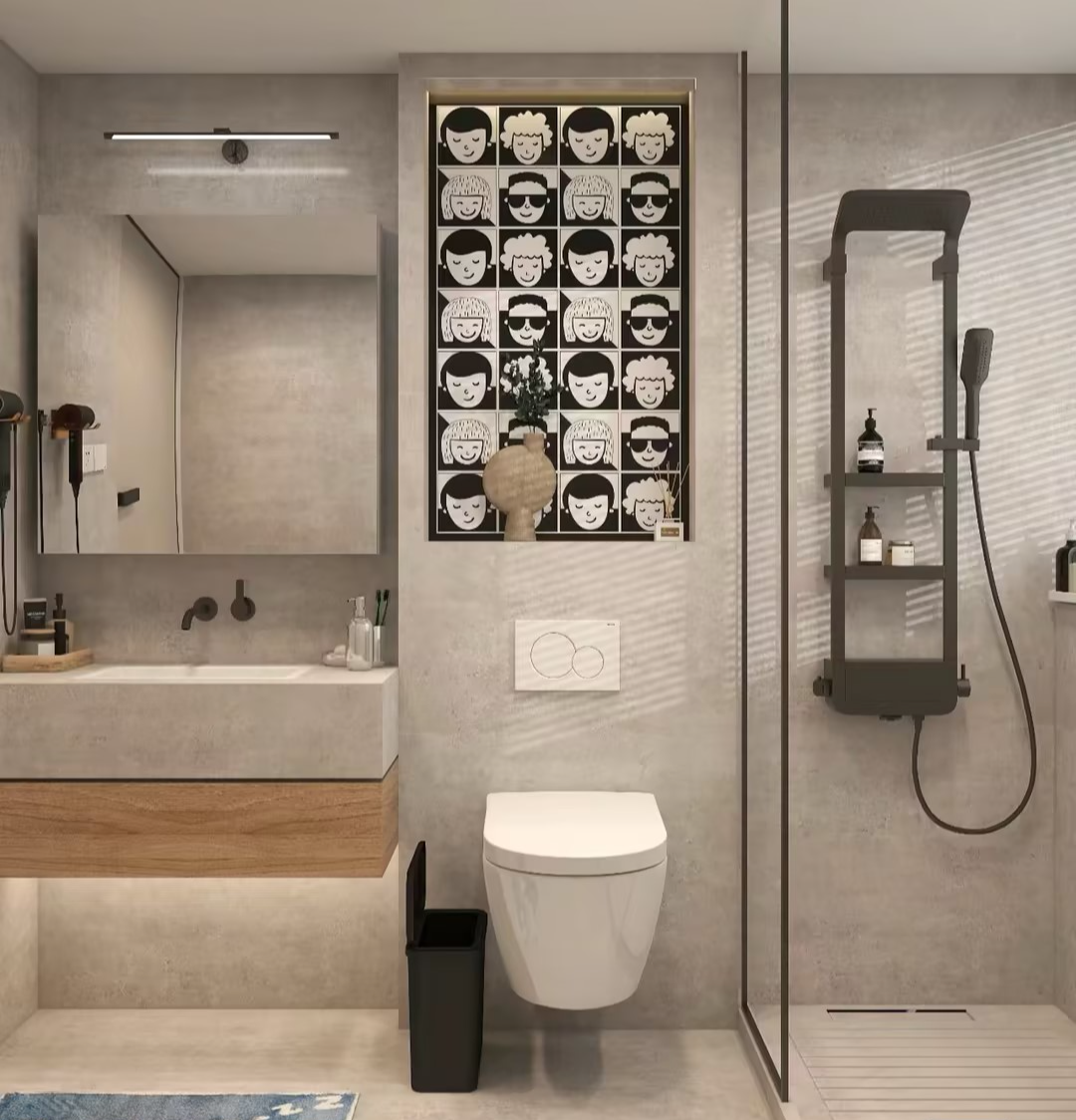 下沉式设计是指淋浴房的地面比干区的地面略微下沉的设计,一般相差2cm左右。这样淋浴区和干区的高度差不要超过3cm,不容易积水,更方便打理。