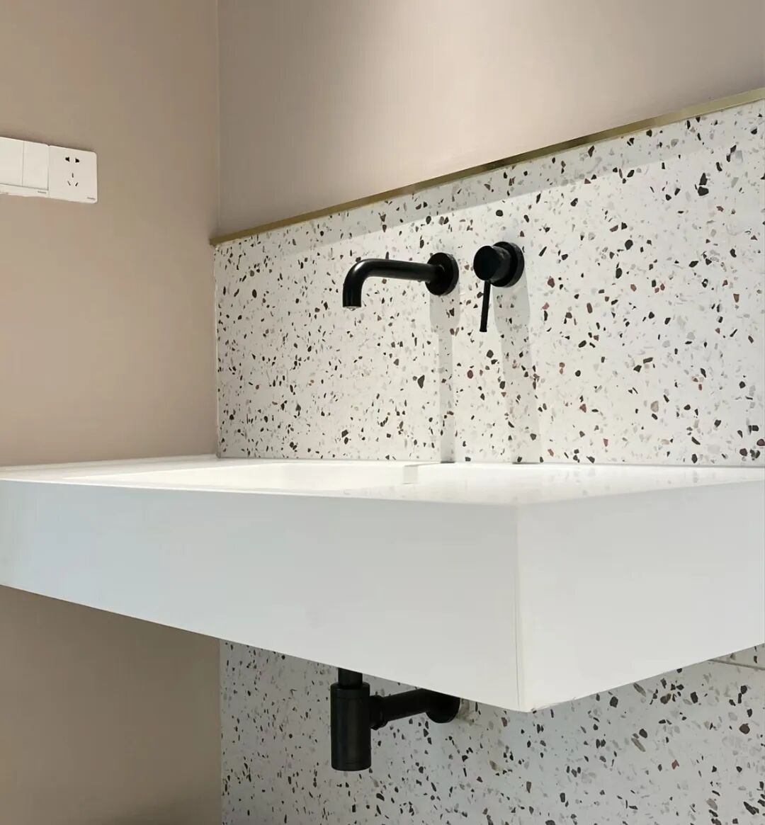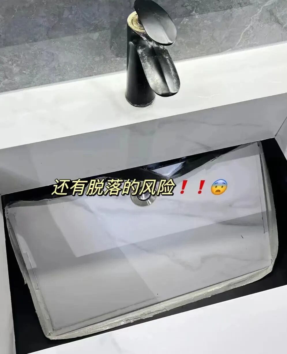 现在有一种很火的网红设计,就是岩板一体盆,但其实很鸡肋。台盆采用直角粘接,边边角角的地方很容易泛黄、发黑,拼接不牢固的话,还可能会掉落。