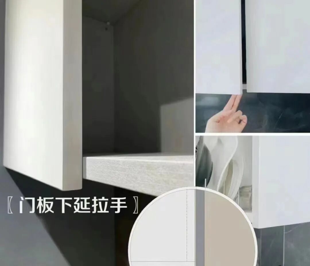 首先无把手的设计,不会藏污纳垢,最好别做容易刮伤手的G形拉手,来回行走也可以避免磕碰,吊柜可以把门板向下延伸1-2cm,地柜则可以做成45°斜切角,直接把柜门往外一拉就打开了。
