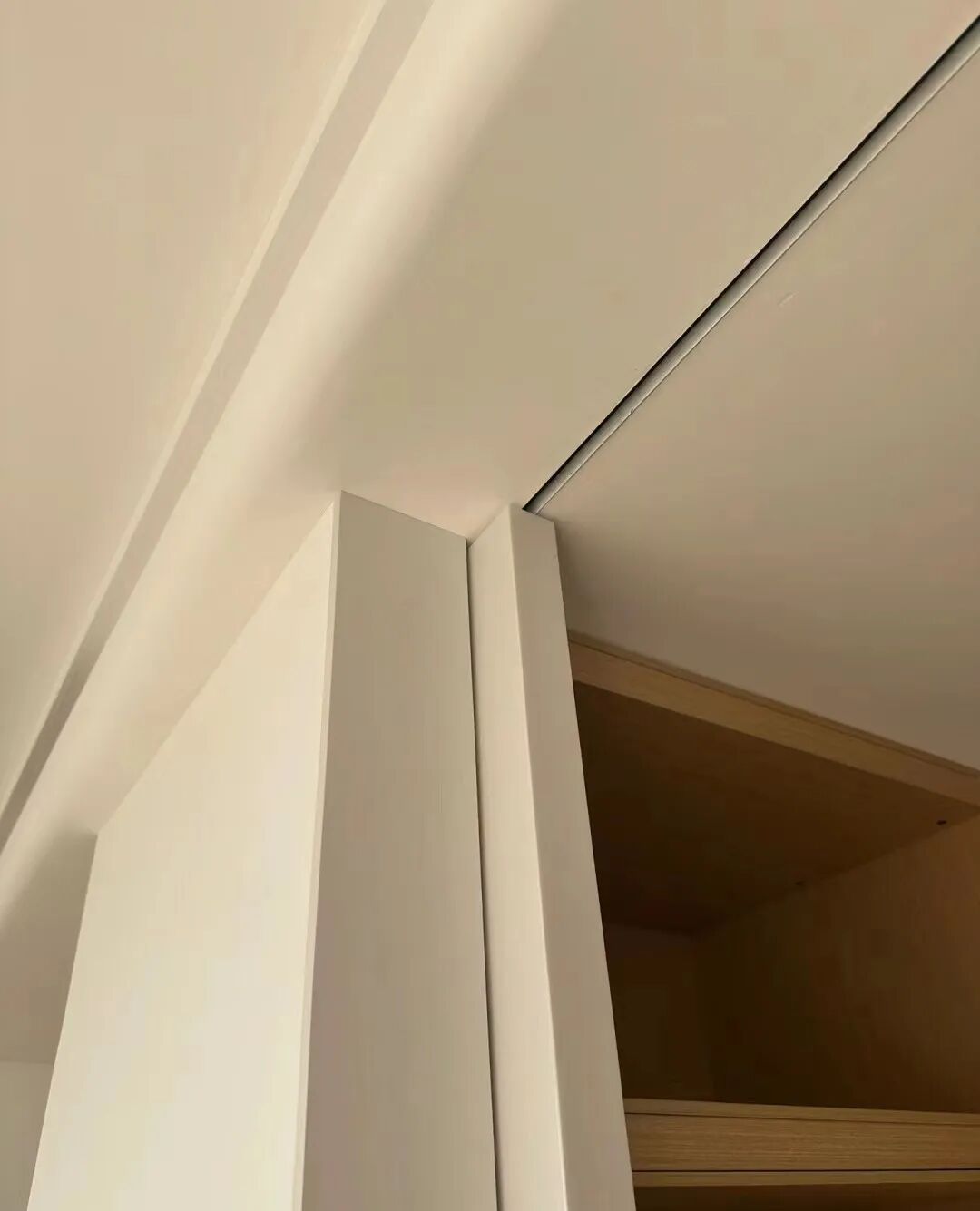 想减轻家务负担,推荐大家做隐藏式吊柜移门,将上边框和配件都藏在墙里,隐藏的方法可以是在承重墙上方凿个洞,或者用石膏板遮起来。