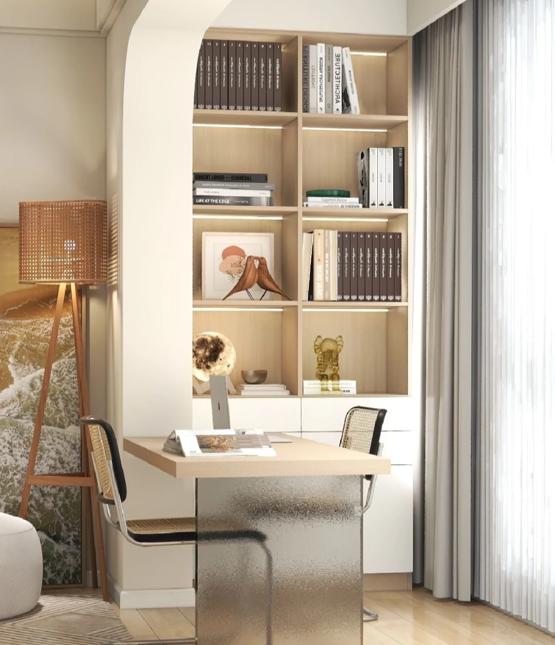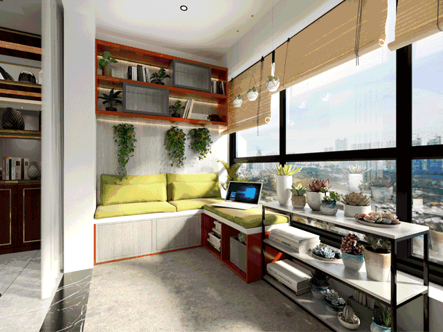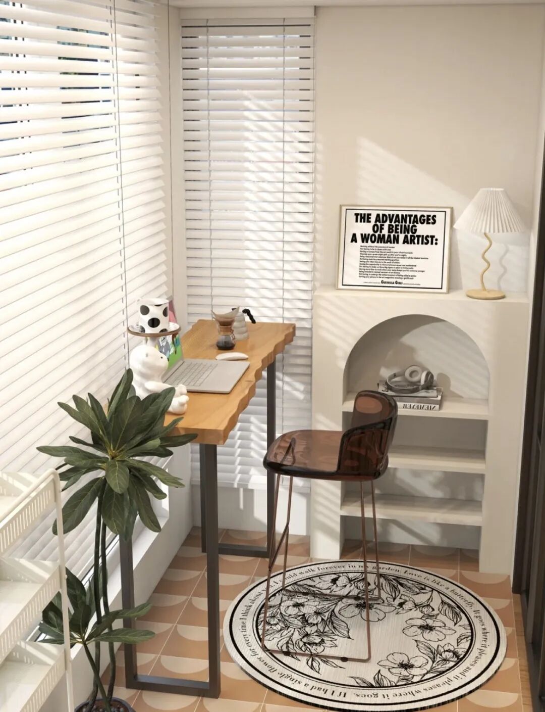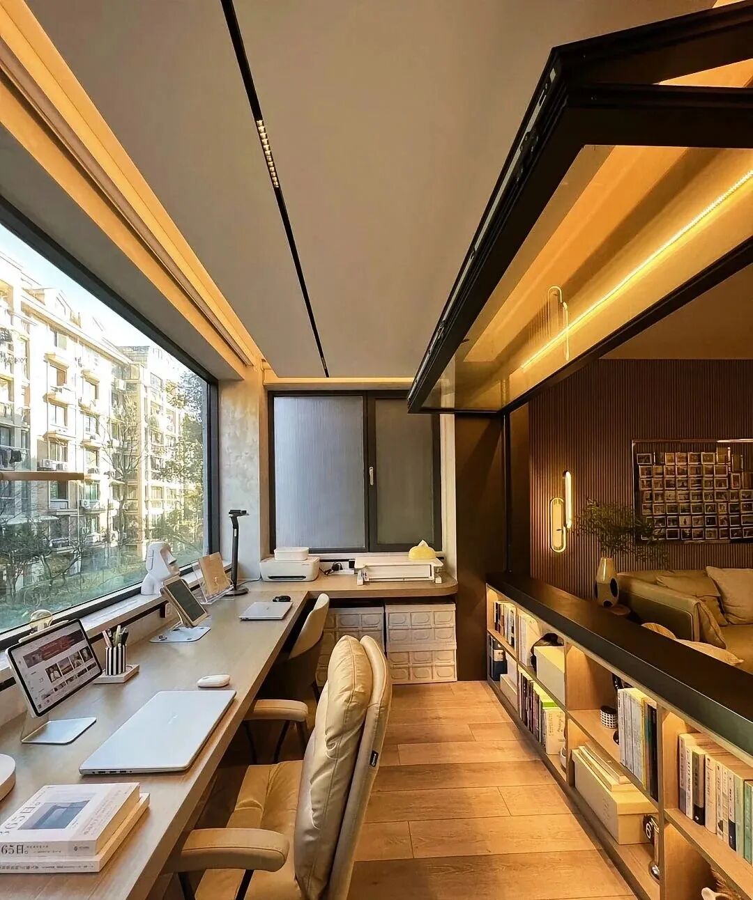 千万不要浪费阳台的窗边区域,窗边可以说是阅读、办公的绝佳之地,视野开阔、空气清新,采光、通风都无敌棒!完美利用空间同时,通过简洁实用的设计,带来舒适而又静谧的工作环境。