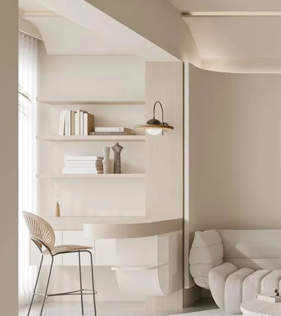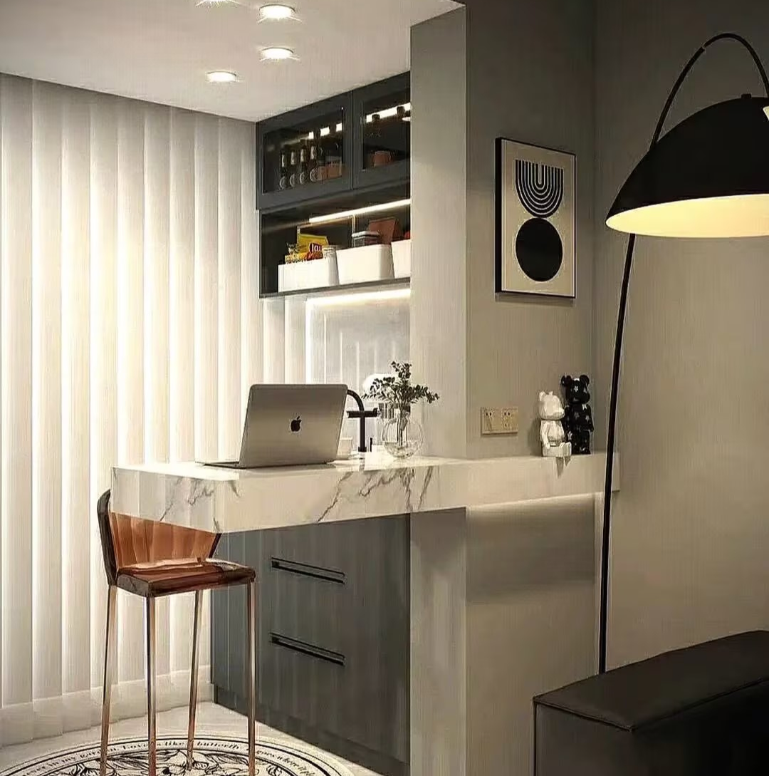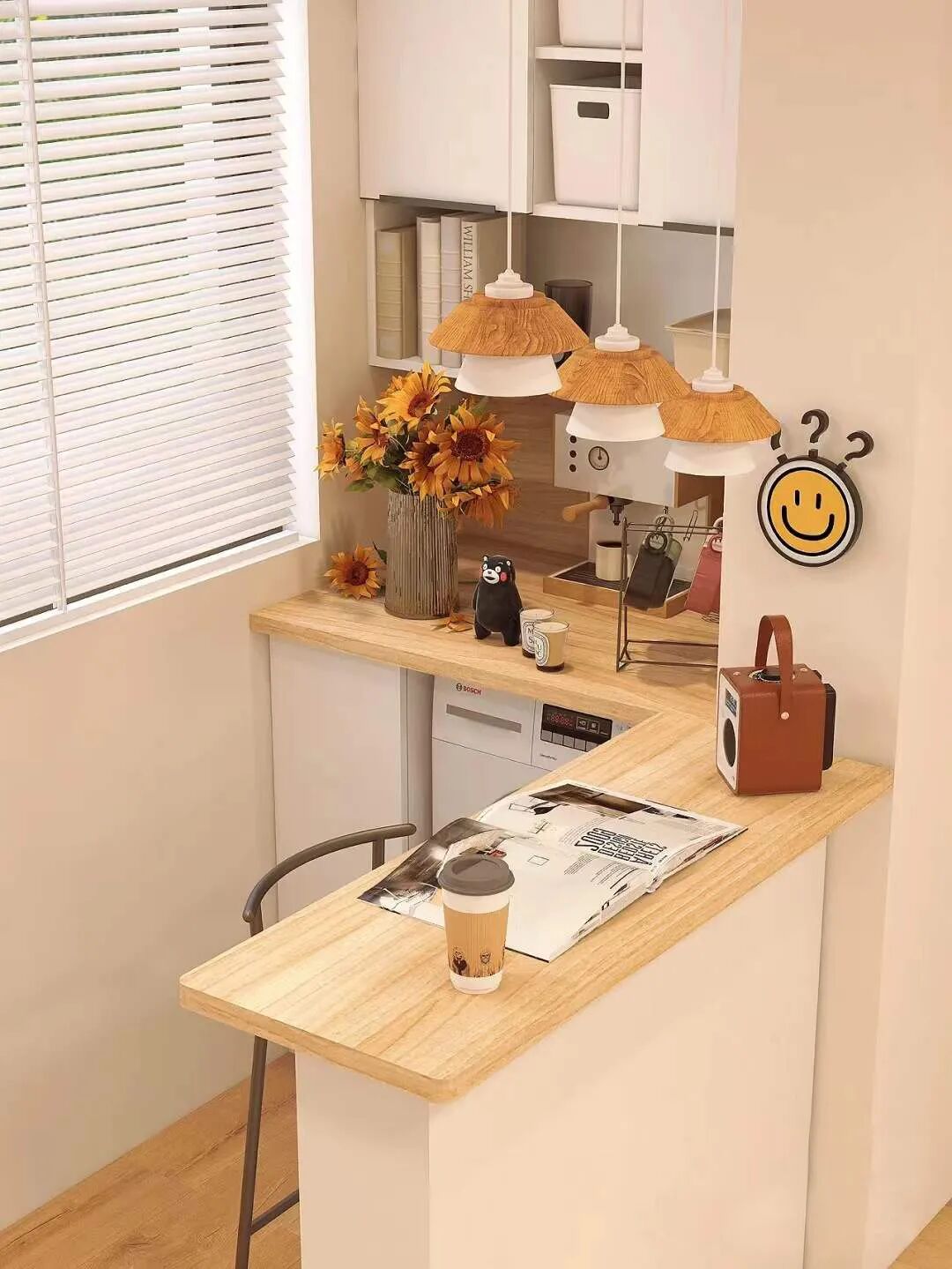 吧台可以是办公区,也是休息区,直接划分出一个“多变的空间”,窗前一个小吧台+嵌入式小书桌+收纳柜体,这个区域完全可以打造成主人专属的“心理驿站”。