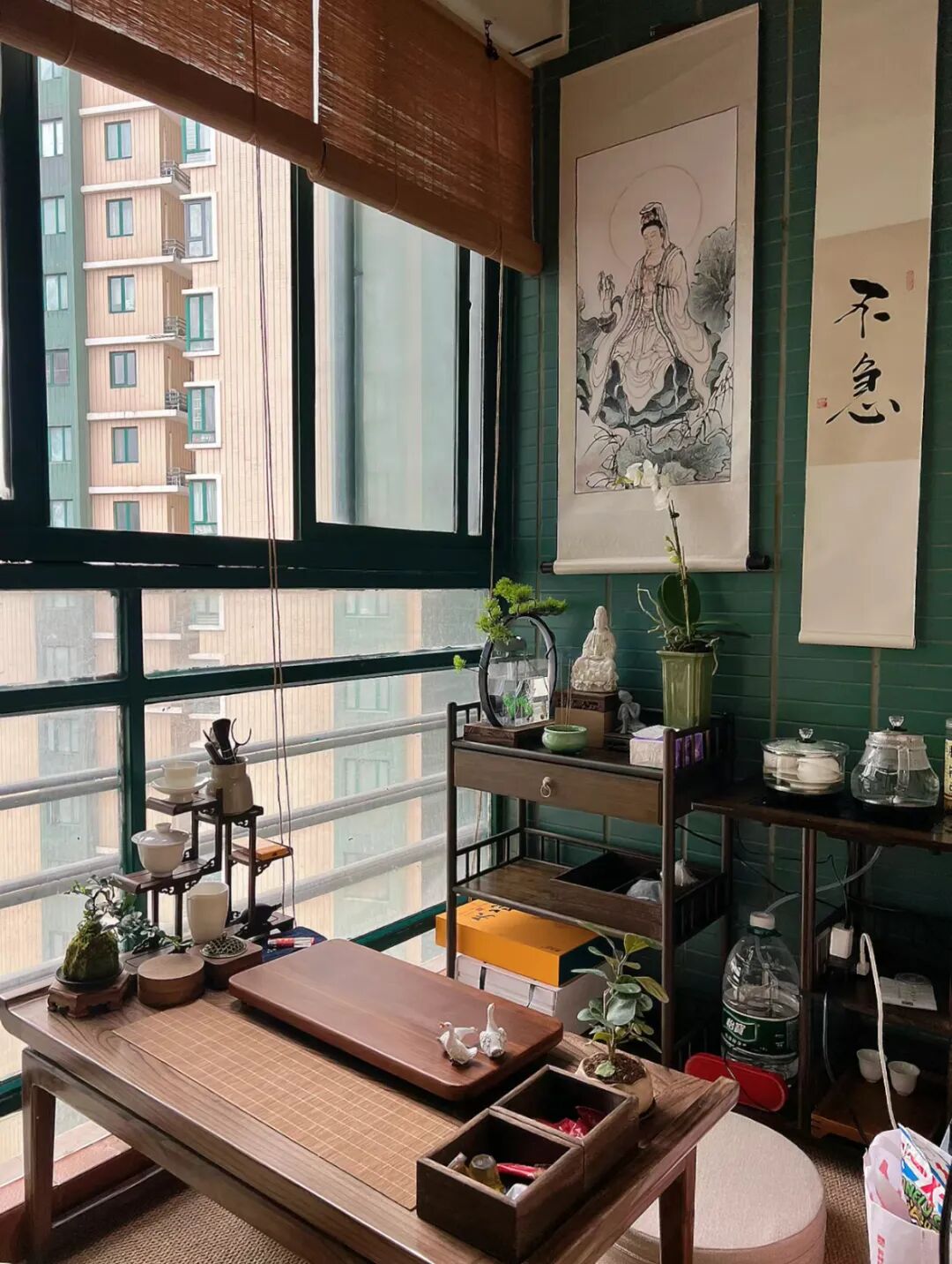 如果嫌坐起不便,还可以以长桌的形式,打造多功能茶室。除了品茗外还可以作为日常小坐休息的区域。低成本打造的阳台茶室,放一些书本和茶具,中间摆放小茶桌,是一种精神的放松。