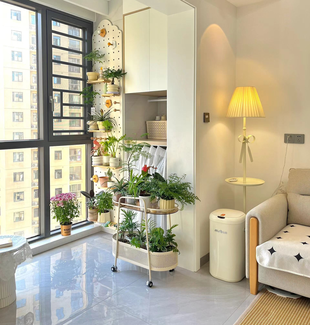 洞洞板一物多用、性价比高,园艺工具、各种小物件统统收纳上墙,搭配搁板还能摆放小盆栽。小餐桌或地上,错落有致摆上几盆,花草和果蔬的香气令人心旷神怡。