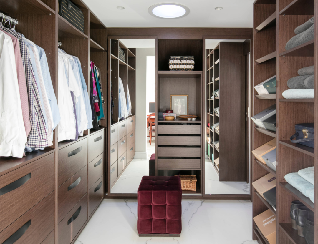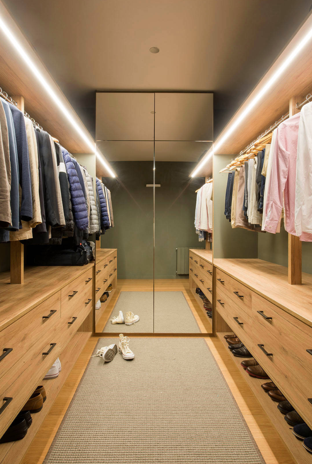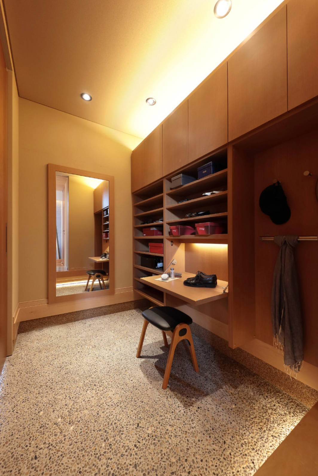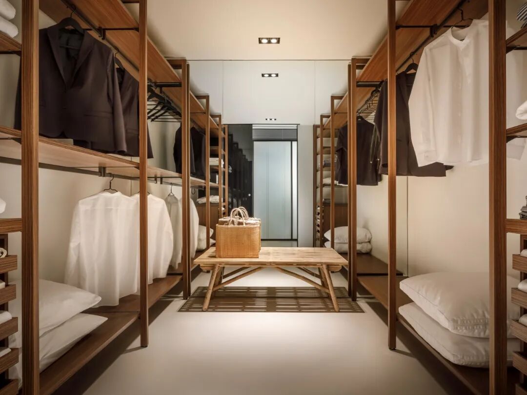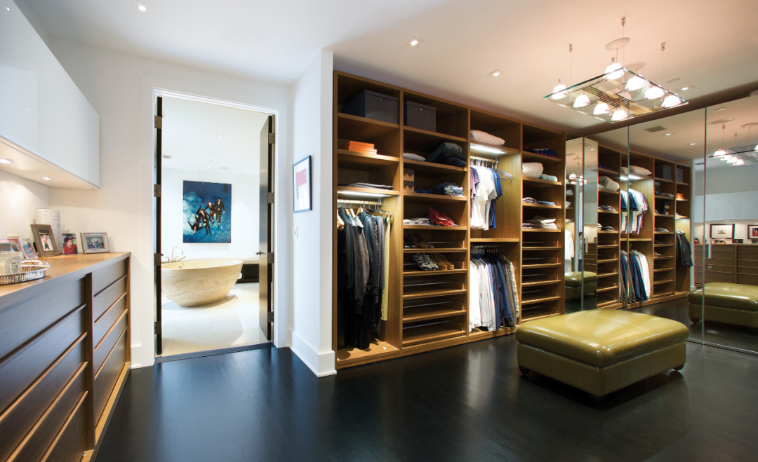 衣帽间的内部也应优化布局。首先就是要确定衣帽间的主要用途,是日常衣服的存放还是过季衣服的存储。当季衣服存放按照个人使用习惯和衣服情况,确定好悬挂、叠放、鞋子、首饰、内衣、行李箱等的比例比重和数量。