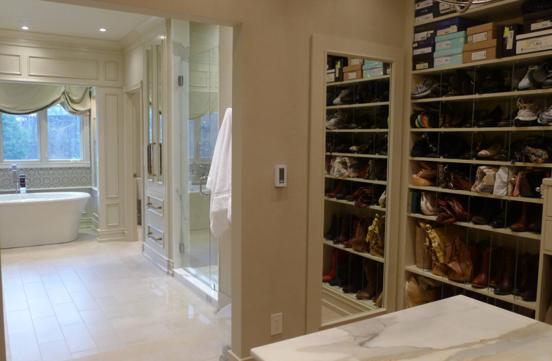 如果自家不是最顶层,楼上的卫浴间防水是你没办法保证的,因此最稳妥的方法就是在衣帽间,再加装防水吊顶。还要协调楼上邻居做闭水试验,虽然漏水的几率很低,但要做好预防工作。