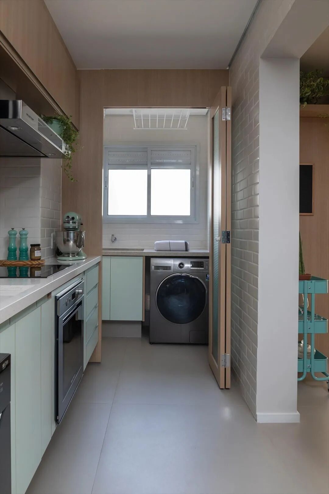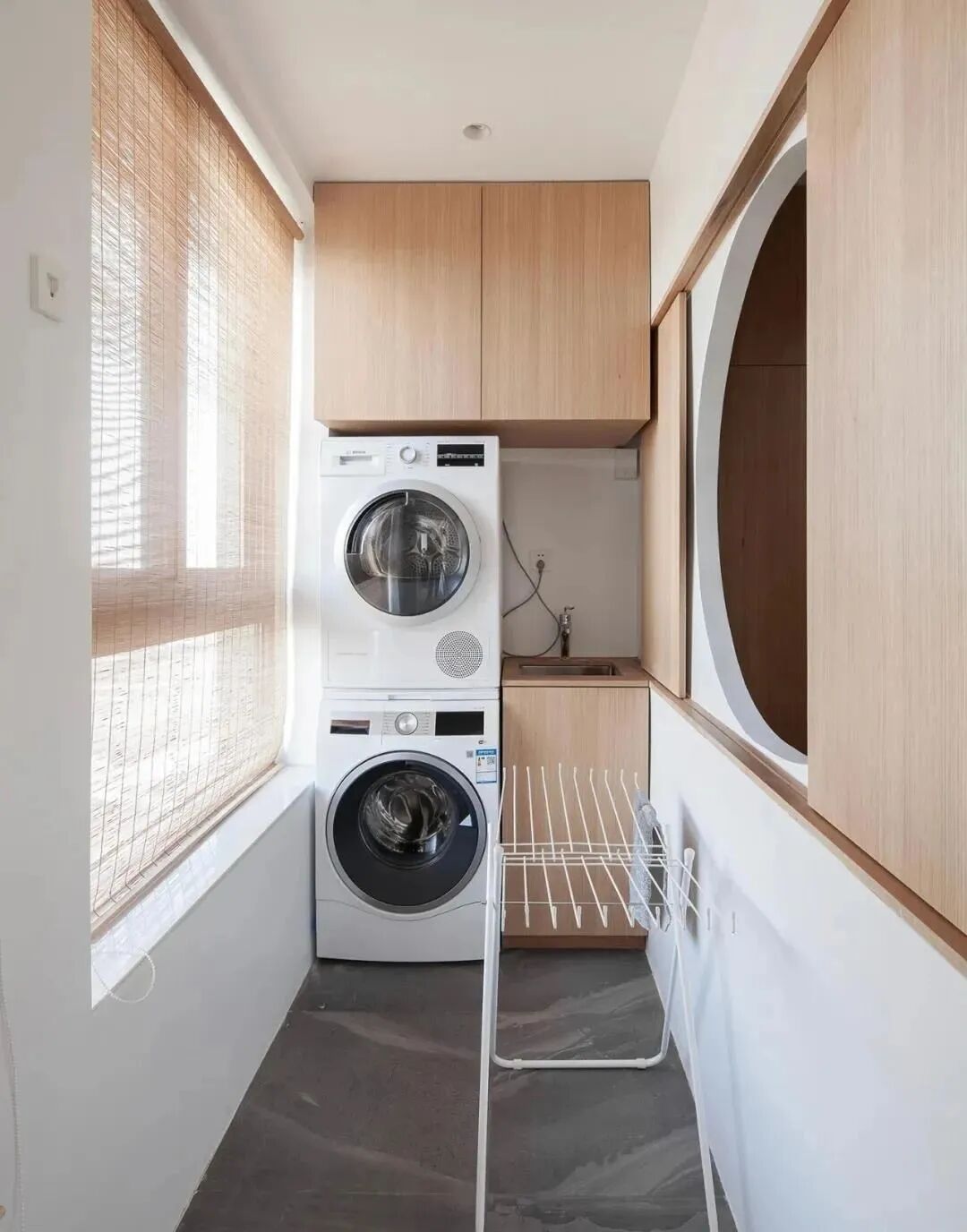 如果阳台宽度<1m,可以将洗衣机、烘干机上下叠放,缝隙空间做成储物格或者直接用收纳推车填满。烘干机、升降式晾衣架、可折叠晾衣架组合使用、用完就收,地面空间想弄成自己喜欢的样子问题也不大。