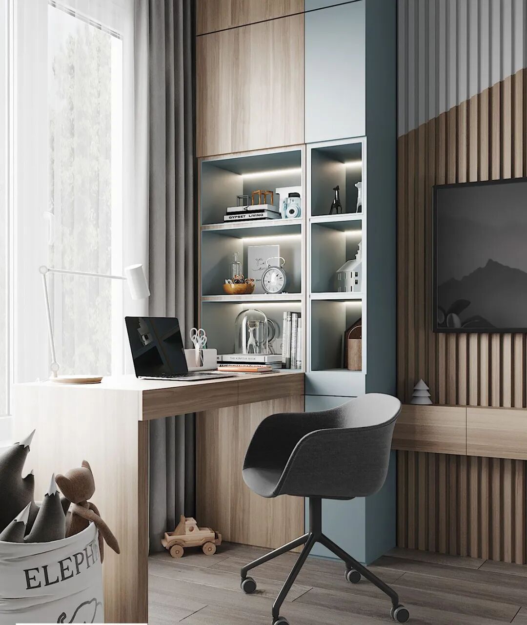 采光良好的阳台用来远程办公、上网课具有天然的优势,素雅的木纹砖纹理天然,防水抗蛀易打理,定制书桌可视阳台面积、人数而定。