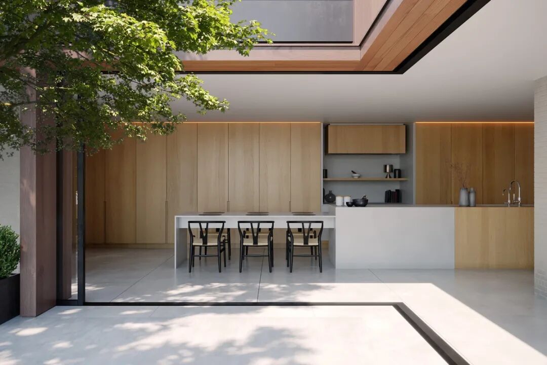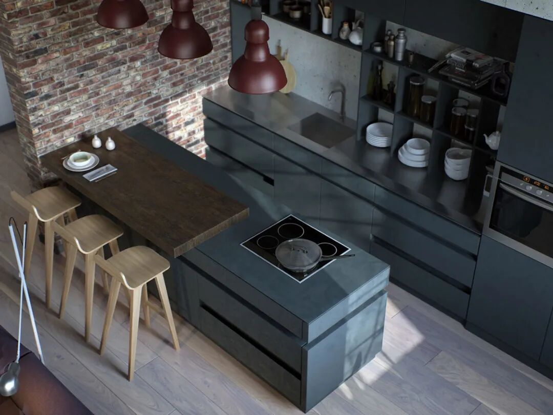 如果开放式厨房不是沿着墙布置的,或者有岛台的话,推荐把餐桌垂直于厨房台面放置。