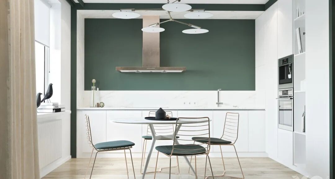 不同于平行于厨房台面,垂直放的话整个餐饮空间会更加紧凑,虽然动线可能没有平行放那么灵活,但占据的面积是最小的。