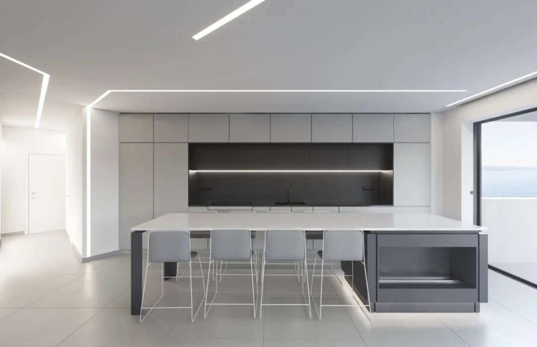 一般是开放式厨房尺寸较大,且沿墙一片铺开时,在与台面平行的位置放置尺寸与厨房差不多的岛台和餐桌。