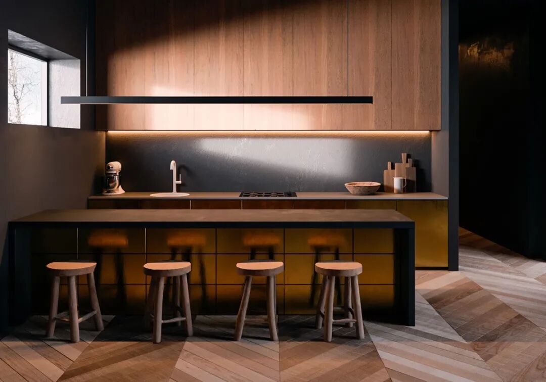 一体化设计的一个小心思是把桌面和台面部分设计成不同的颜色或者材质,将用餐区和做菜区区分开来。