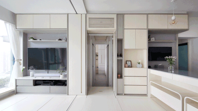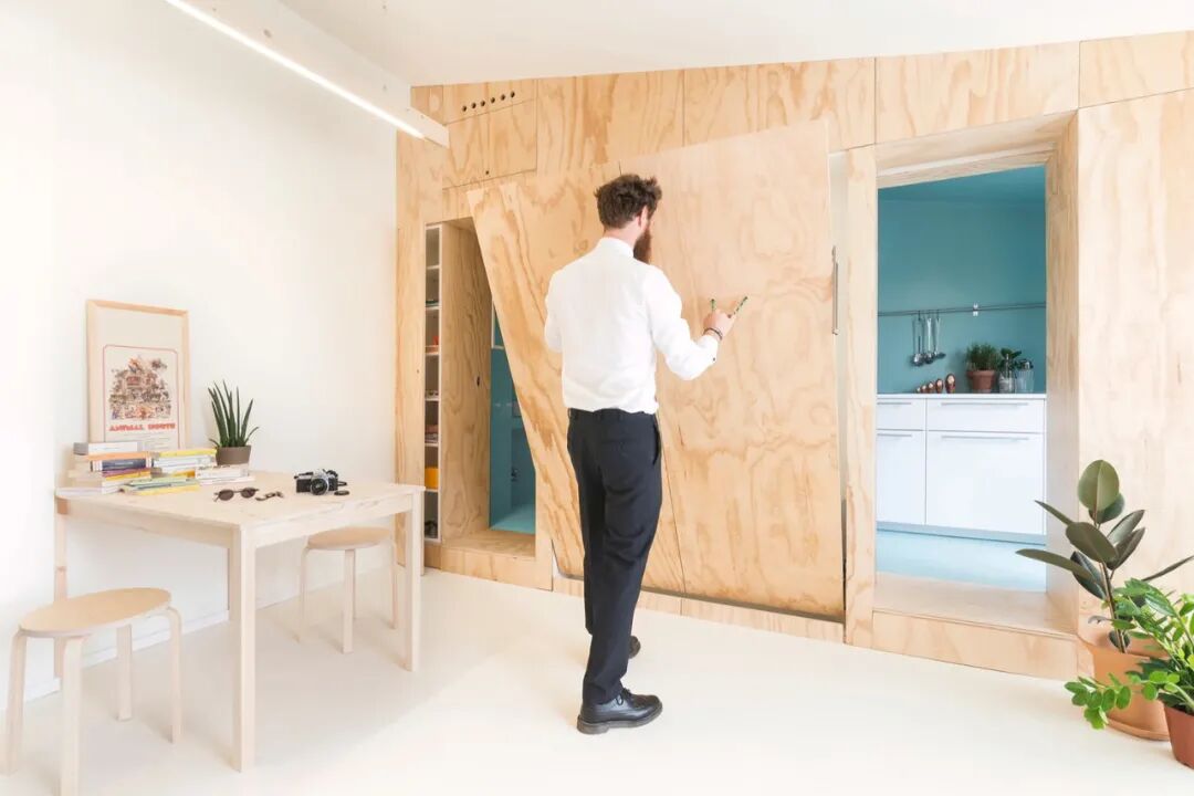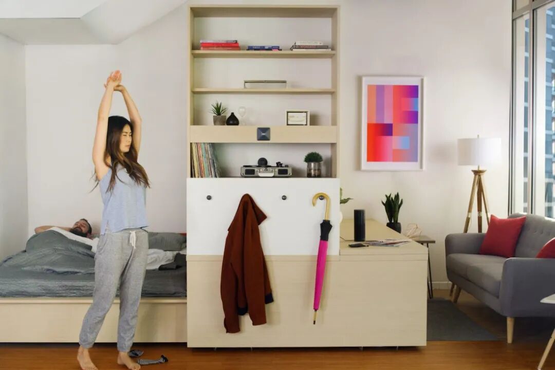 设计师可能会使用可变形的家具,多用途的架子或可伸缩的储存家具。